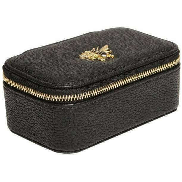 This women's mini travel jewellery box by the brand Alice Wheeler London is made from vegan faux leather and faux suede interior and is showcased in black. It measures 8cm(height) x 13cm(width) x 5cm(depth). All the jewellery boxes come complete with alice wheeler packaging. The Alice Wheeler London Mini Travel Jewellery Box - Black will become an all-time favourite with its great organisation and perfect size to slip into your bag whatever the occasion. Perfect for adding to any bag to keep your jewellery organised in one place whilst doing it in style, whether that’s for when you go to the gym, on a weekend away, or just to store your favourite pieces. The gold-toned zipper closure offers security and luxury. Complete with the signature honeybee logo adorned to the top of this case.