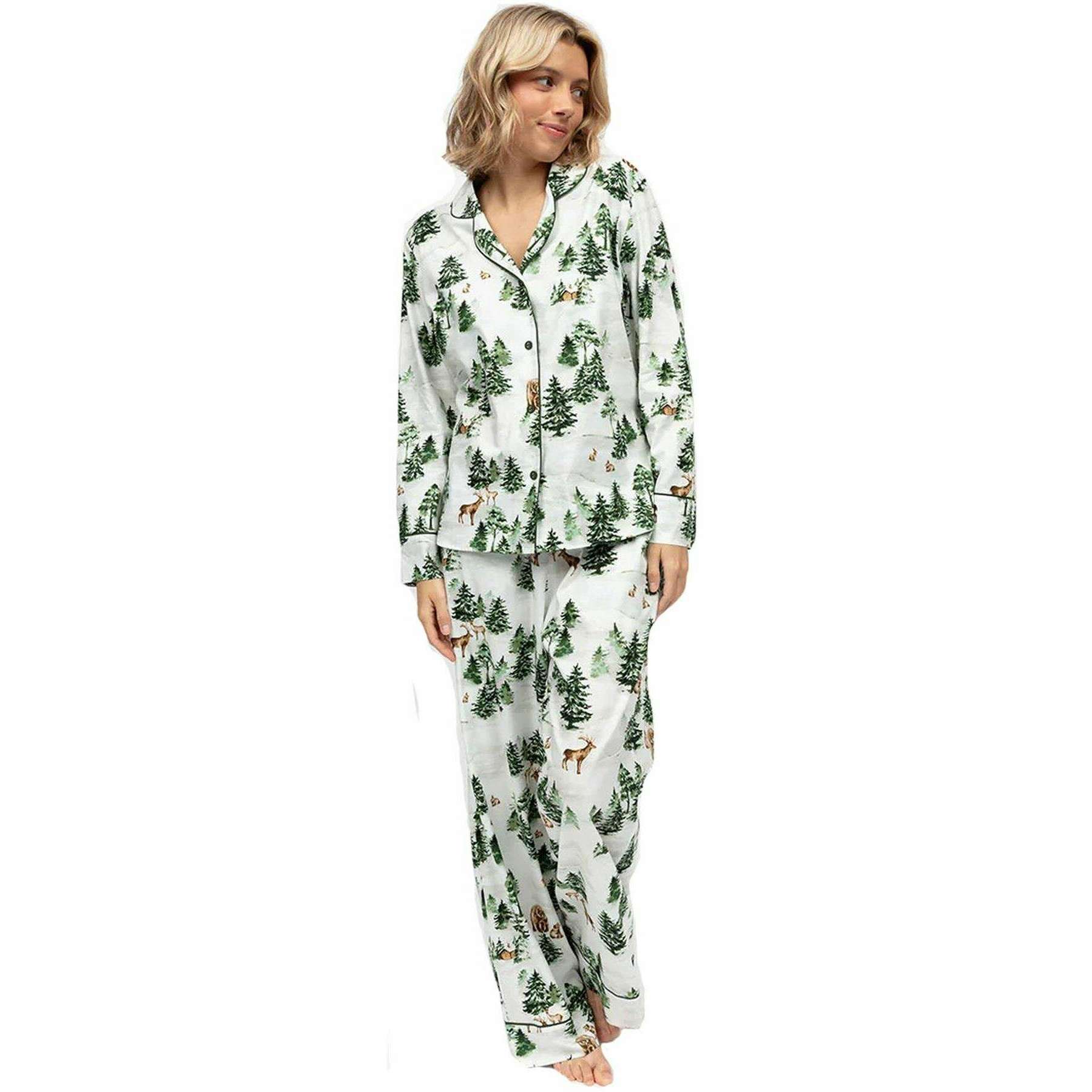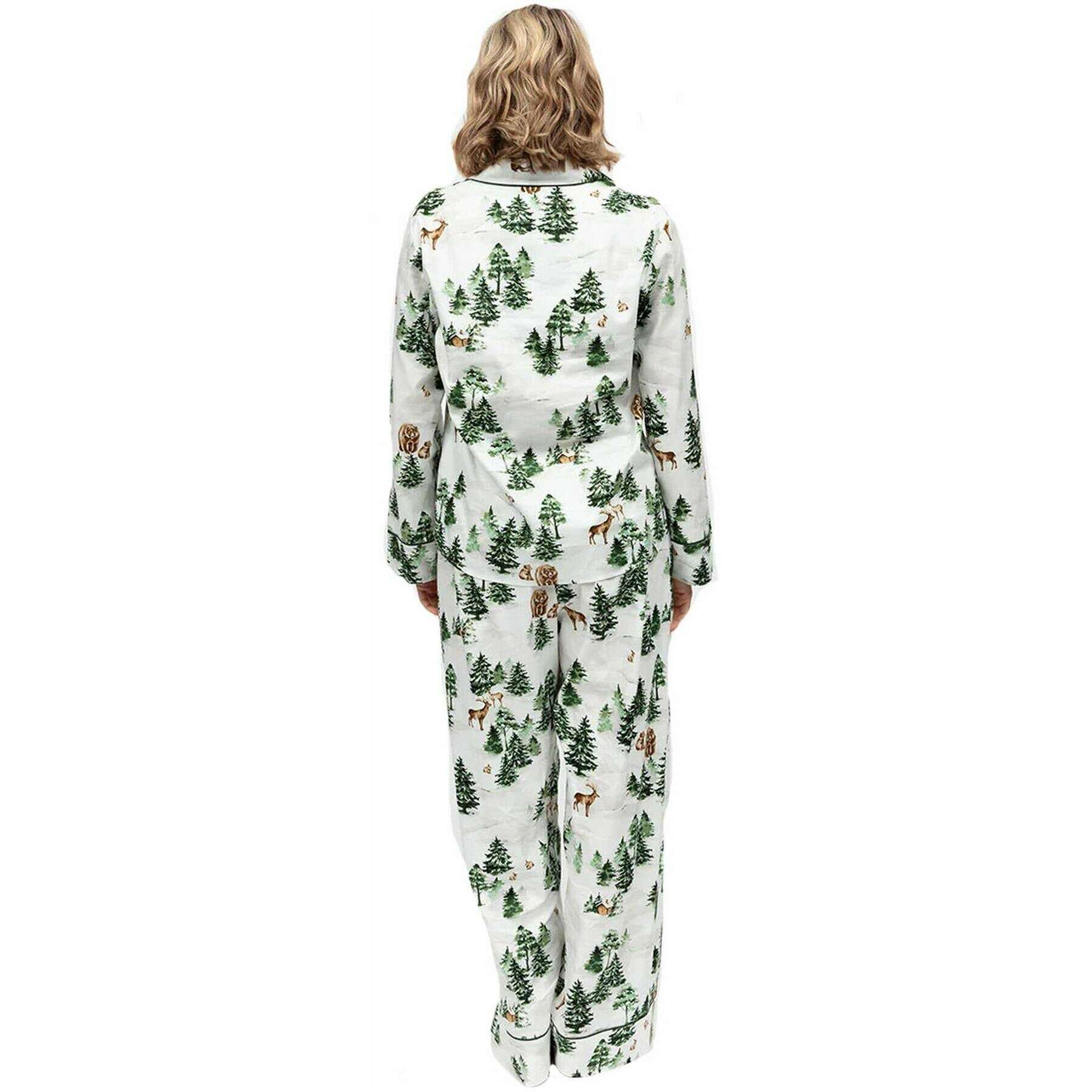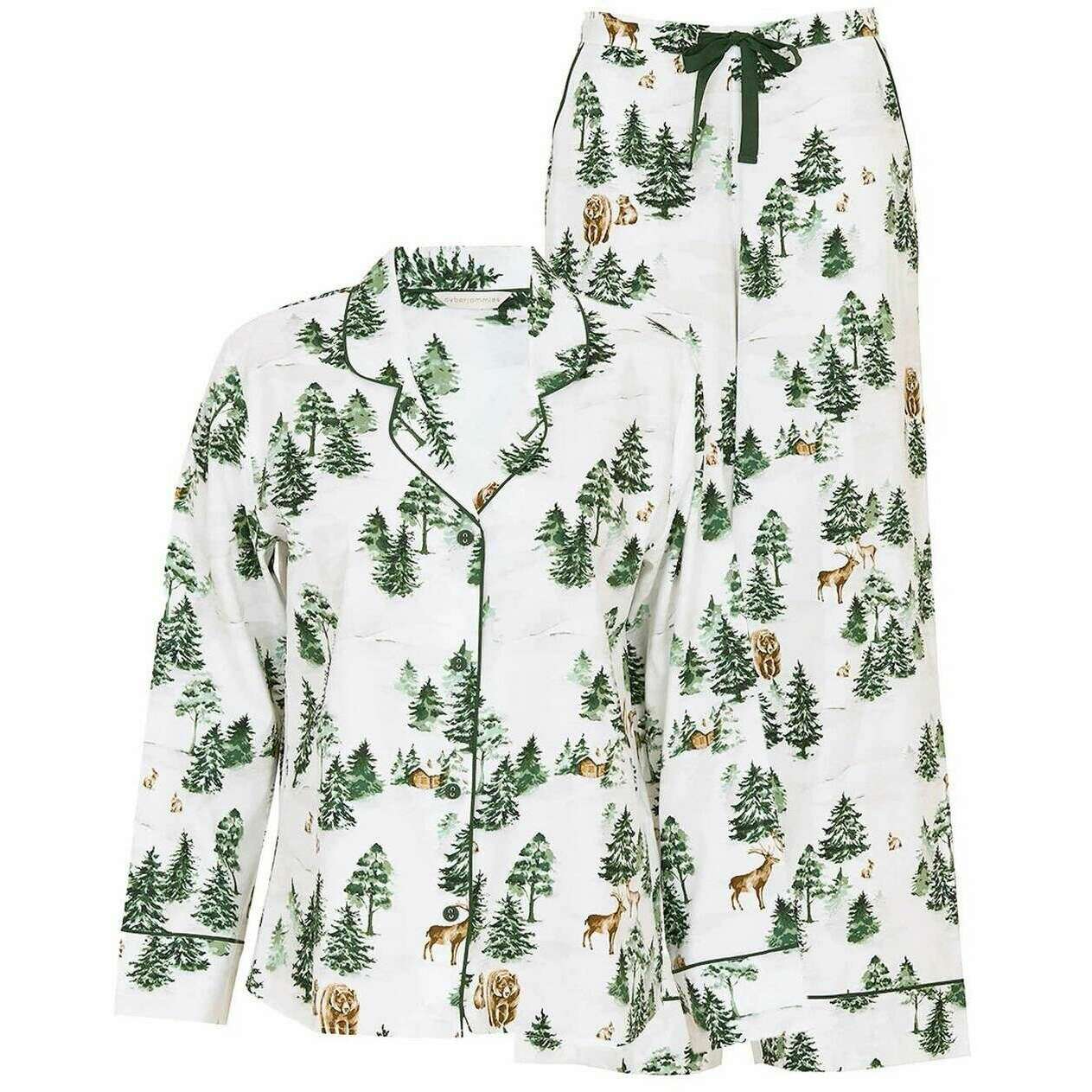 Deze dames pyjamaset van jersey met varen-alpenprint van het merk Cyberjammies is gemaakt van 60% katoen en 40% modal en is uitgevoerd in het groen. Ook de olijfgroen/witte pyjama is ontworpen in een bloemmotief. Het wordt aanbevolen om binnenstebuiten in de machine te wassen, niet te weken, met soortgelijke kleuren te wassen om deze pyjama in goede staat te houden. Alle pyjama's worden compleet geleverd met cyberjammies-tags. De Cyberjammies Fern Alpine Print Jersey Pyjamaset - Olijfgroen/Wit brengt een gezellige wintersfeer in je vrije tijd. Deze set is gemaakt van een zachte katoen-modalmix en heeft een serene alpine print van pijnbomen, hutten en bosdieren op een frisse witte achtergrond. De top heeft een reverskraag, olijfgroene biezen en bedekte knopen voor een getailleerde afwerking, terwijl de broek met wijde pijpen een elastische achterkant, een platte voorkant, een verstelbaar trekkoord en zijzakken heeft voor comfort en gemak. Deze set is perfect voor feestelijke ochtenden of ontspannen avonden en combineert seizoenscharme met alledaagse luxe.