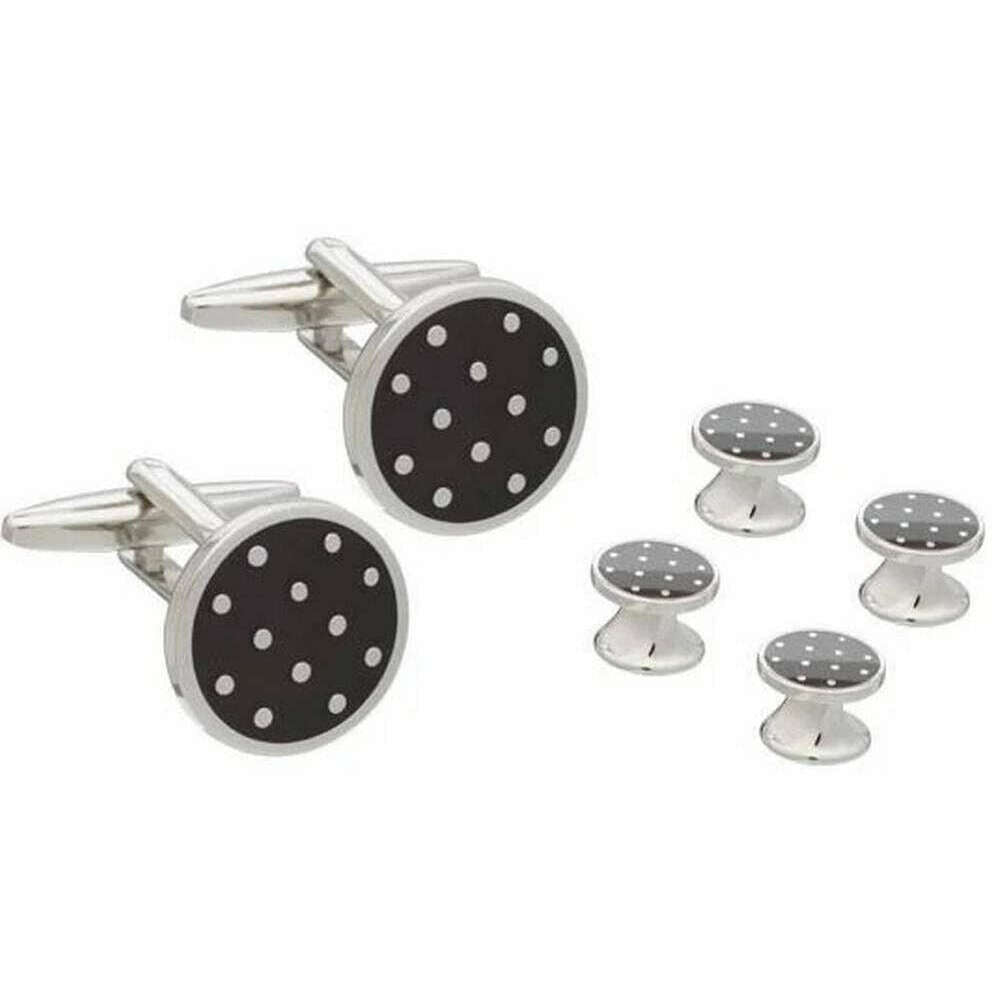 Deze set met stippen en manchetknopen voor heren is gemaakt door het merk David Van Hagen in een zilveren kleur en is gemaakt van onedel metaal. Alle shirtknopen worden compleet geleverd met een David van hagen-verpakking. De David Van Hagen Polka Dot Jurk met studs en manchetknopen - Zwart/Zilver heeft een prachtig uniek ontwerp dat bij vele gelegenheden zeker indruk zal maken. Deze manchetknopen en studs zijn perfect voor een stijlvolle heer om aan zijn collectie toe te voegen, omdat ze bij elke outfit passen. Ze hebben een prachtig zwart stippenontwerp.