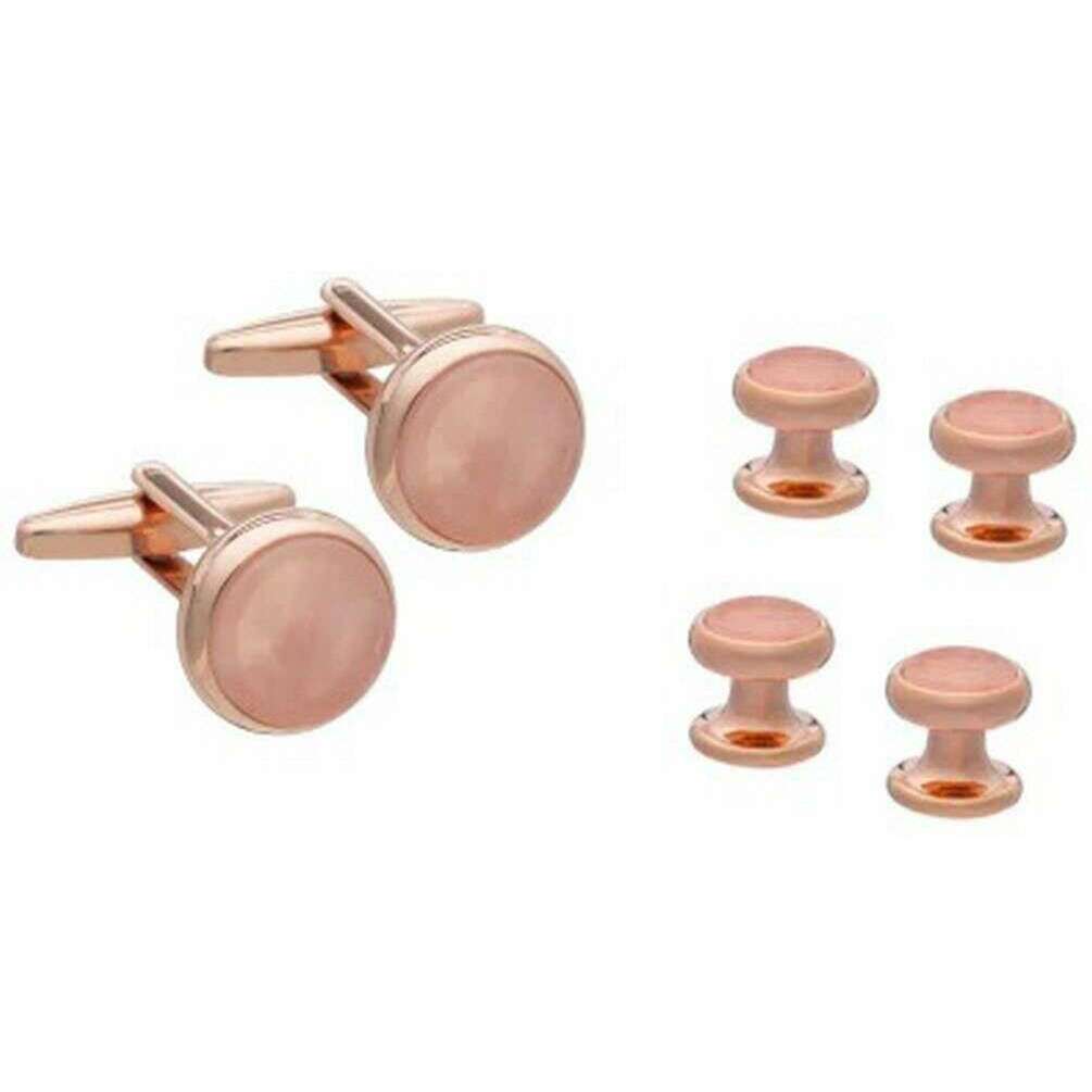 Deze goed gemaakte rozenkwarts-set met studs en manchetknopen voor heren van David Van Hagen is verkrijgbaar in een roze/roségouden kleur en is vervaardigd uit onedel metaal. Alle shirtknopen worden compleet geleverd met een David van hagen-verpakking. De David Van Hagen Rose Quartz Jurk Stud en Manchetknopenset - Roze/Rose Goud is voorzien van trendy roségouden details en een roségouden steen. De manchetknopen zijn voorzien van een standaard bascule, waardoor je ze eenvoudig aan je kleding kunt toevoegen en verwijderen. Deze bijpassende set is perfect voor alle gelegenheden en voegt een vleugje luxe toe aan je kleding.