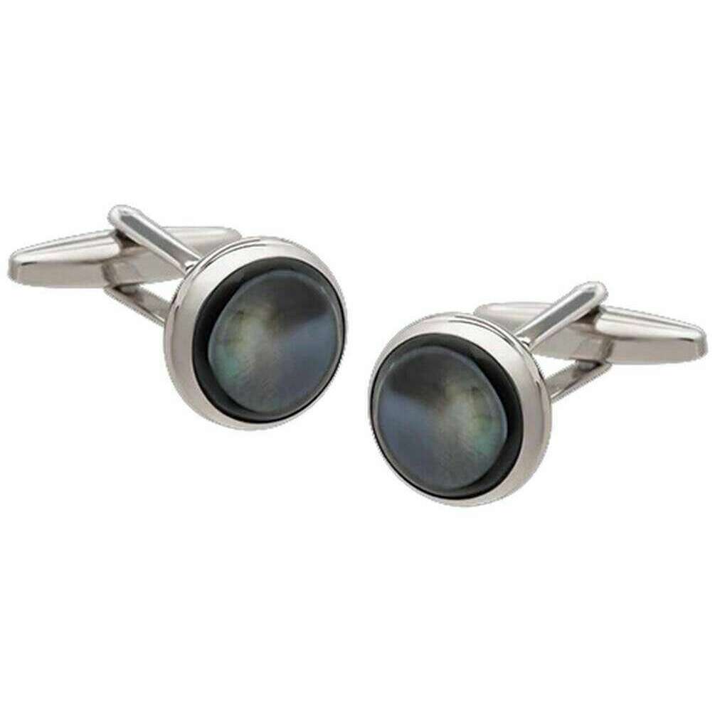 • Standaard manchetknopen bascule, 14 mm diameter, concave dip rokerige parelmoersteen, natuurlijke halfedelstenen, zilveren behuizing