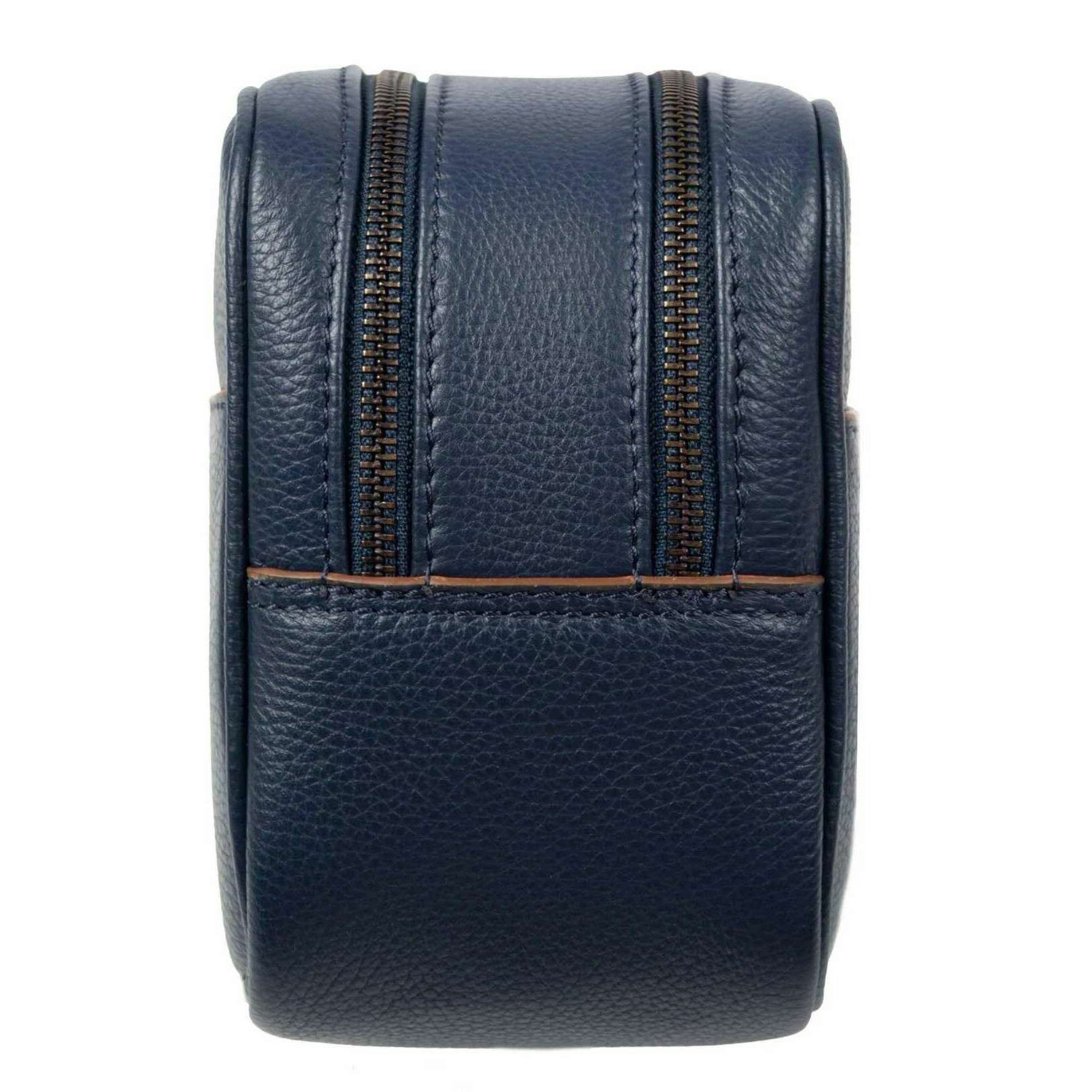 Maak kennis met deze Cherwell toilettas voor heren van Dents, gemaakt van 100% kiezelnerf leer in een marine/cognacbruine kleur. De afmetingen zijn 25 cm (hoogte) x 15 cm (breedte) x 10 cm (diepte). Alle tassen worden compleet geleverd met deuklabels. De Dents Cherwell Toilettas - Marine/Cognac Bruin is perfect voor dagelijks gebruik en een handige metgezel op reis. Het heeft twee grote aparte compartimenten met ritssluiting en steekvakken aan de binnenkant. Deze tas is gemakkelijk te dragen met een leren zijhandvat en is bovendien waterdicht. De buitenkant van de tas is voorzien van het Dents-logo in reliëf voor een verfijnde uitstraling.