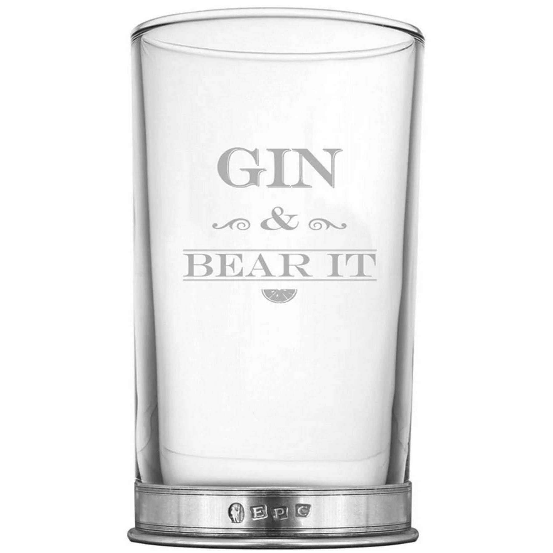 Designer English Pewter Company heeft u dit unisex -glas en tinnen drinkware en glaswerk meegenomen met behulp van heldere tonen. Het meet 12,75 cm (hoogte). Al het drinkware en glaswerk zijn compleet in een Engelse tinnen bedrijf Giftbox. Het Engelse tinnen bedrijf 12oz gin en bear het single gin highball glas - Clear is een uitstekende manier om te genieten van je favoriete drankje met zijn slanke ontwerp en tijdloze charme. De basis heeft een tinnen banding die na verloop van tijd niet zal aantasten, zodat je het nog jaren in de familie kunt houden. Het siert ook enkele wijze woorden die de perfecte finishing touch toevoegen. Dit zou een doordacht geschenk zijn.