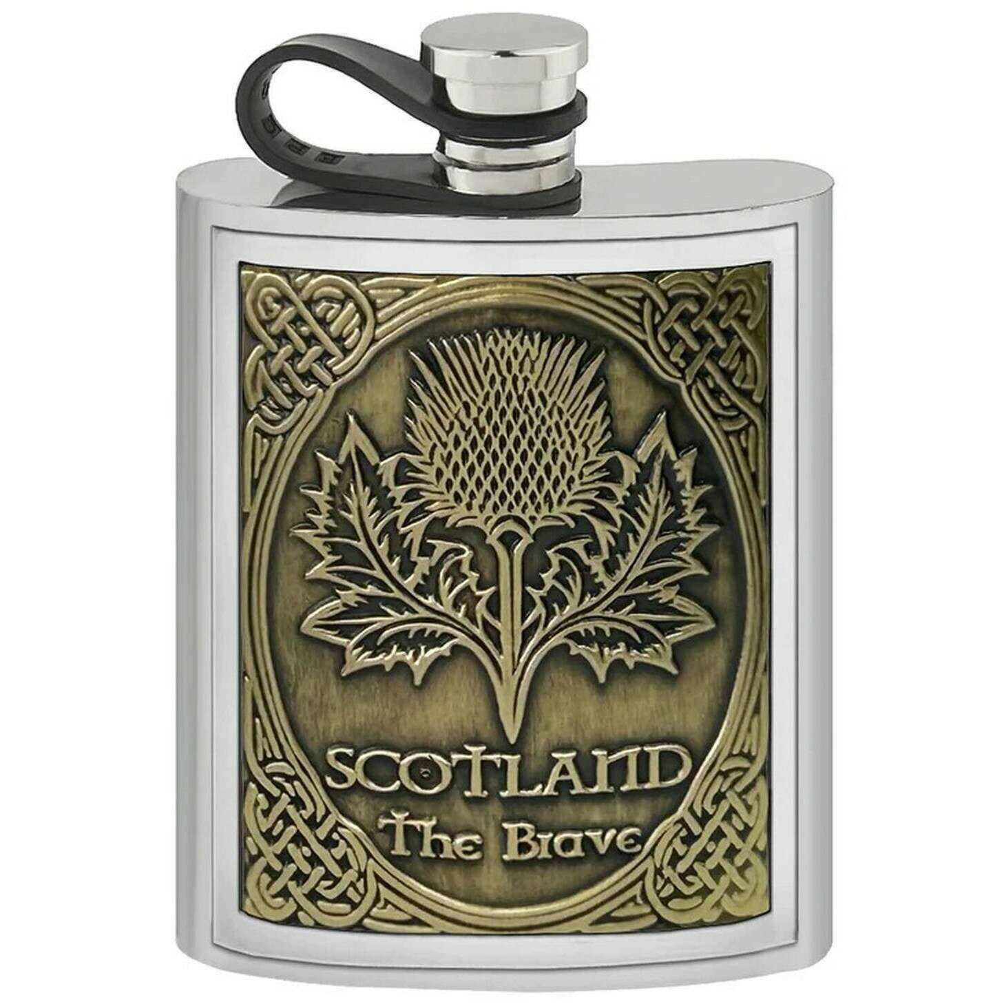 Engelse tinbedrijf 6oz reliëf distel tinnen kolf - zilver/messing goud