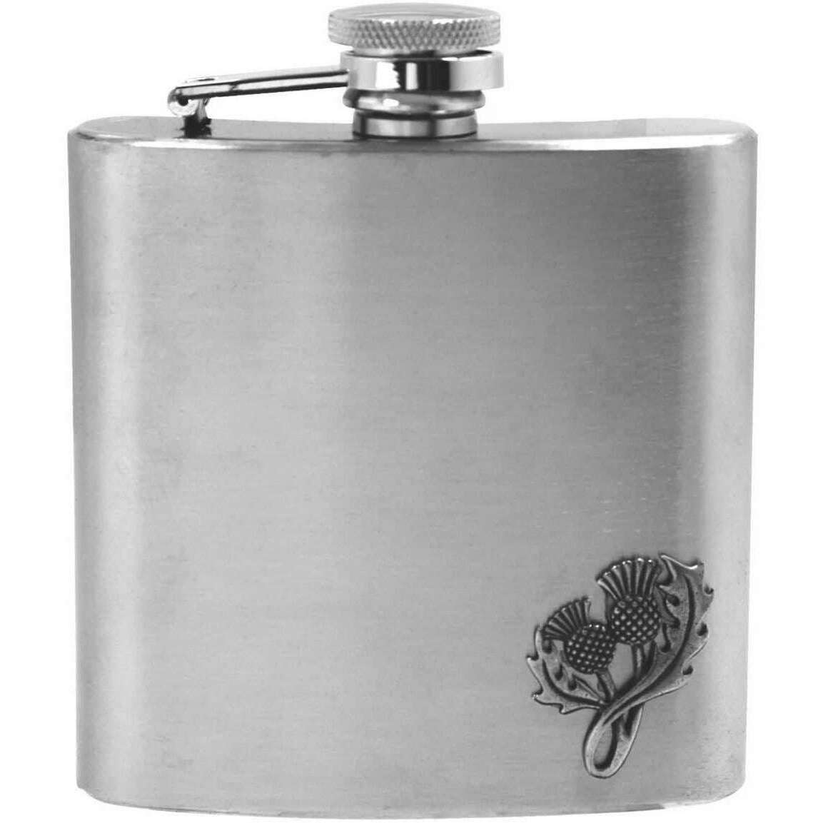 Engels tinnen bedrijf 6oz distel badge kolf - zilver