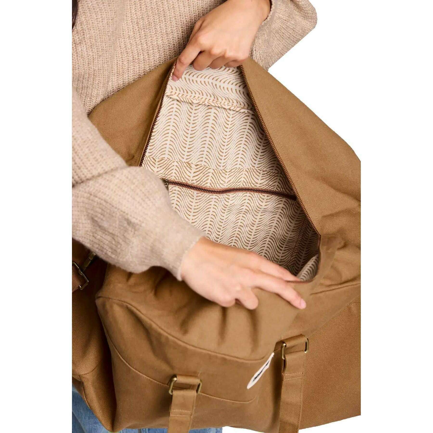 Designer Hindbag heeft u deze unisex 100% biologische katoenen tas met kaneelbruine tonen gebracht. Het meet 33 cm (hoogte) x 54 cm (breedte) x 24 cm (diepte). Alle tassen worden compleet geleverd met een achterpakket. De Hindbag Yves grote reistas - Cinnamon Brown is een ruime en milieuvriendelijke optie voor reizigers. Deze tas is gemaakt van dik, GOTS-gecertificeerd organisch katoen en beschikt over meerdere zakken voor organisatie, een veilige ritssluiting en een bedrukte binnenvoering die een vleugje elegantie toevoegt. Met zijn handgrepen en grote verstelbare schouderriem kan deze tas gemakkelijk met de hand of op de schouder worden gedragen.