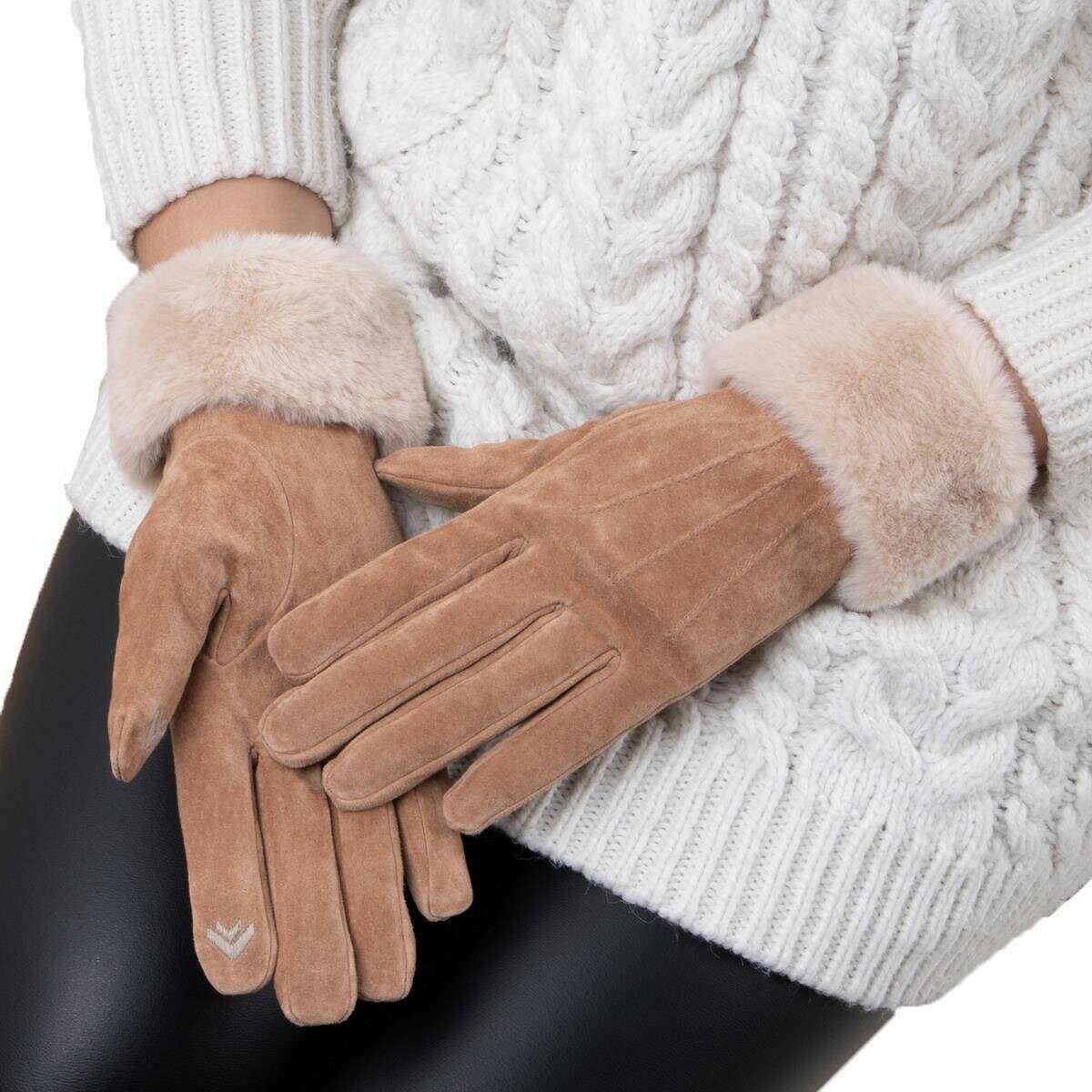 • SmarTouch-technologie op wijsvingers en duimen, echt suède, manchet van imitatiebont, ultrazachte voering
