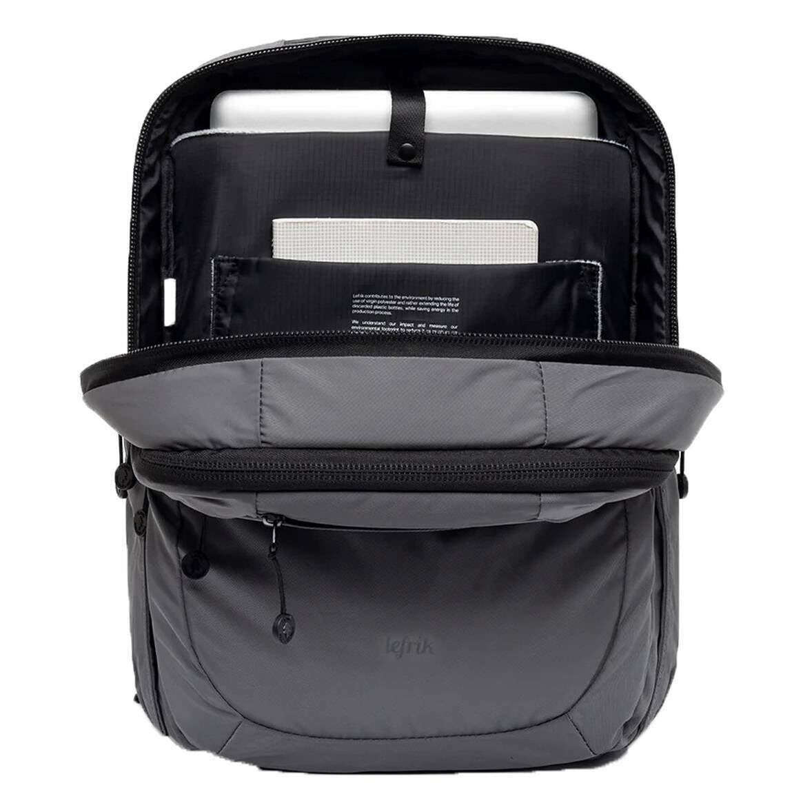 Deze 101 rugzak van Lefrik is gemaakt van grijze, 100% ultralichte stof en is perfect voor mannen of vrouwen en een musthave. De afmetingen zijn 40 cm (hoogte) x 25 cm (breedte) x 12 cm (diepte). Alle tassen worden compleet geleverd met een Lefrik-verpakking. De Lefrik 101 Rugzak - Grijs is een strakke, duurzame en praktische keuze voor dagelijks woon-werkverkeer en zakenreizen. Deze rugzak is gemaakt van gerecyclede plastic flessen en heeft een hoofdcompartiment met gewatteerde hoes voor laptops, tablets en dagelijkse benodigdheden van maximaal 15,6 inch. Voor een efficiënte organisatie heeft deze tas twee snel toegankelijke vakken met ritssluiting, één aan de bovenkant en één aan de voorkant. Met een gewatteerde achterkant en handgrepen voor comfort, kan deze rugzak worden bevestigd aan het handvat van een trolleykoffer om hem veilig te houden tijdens uw reizen.
