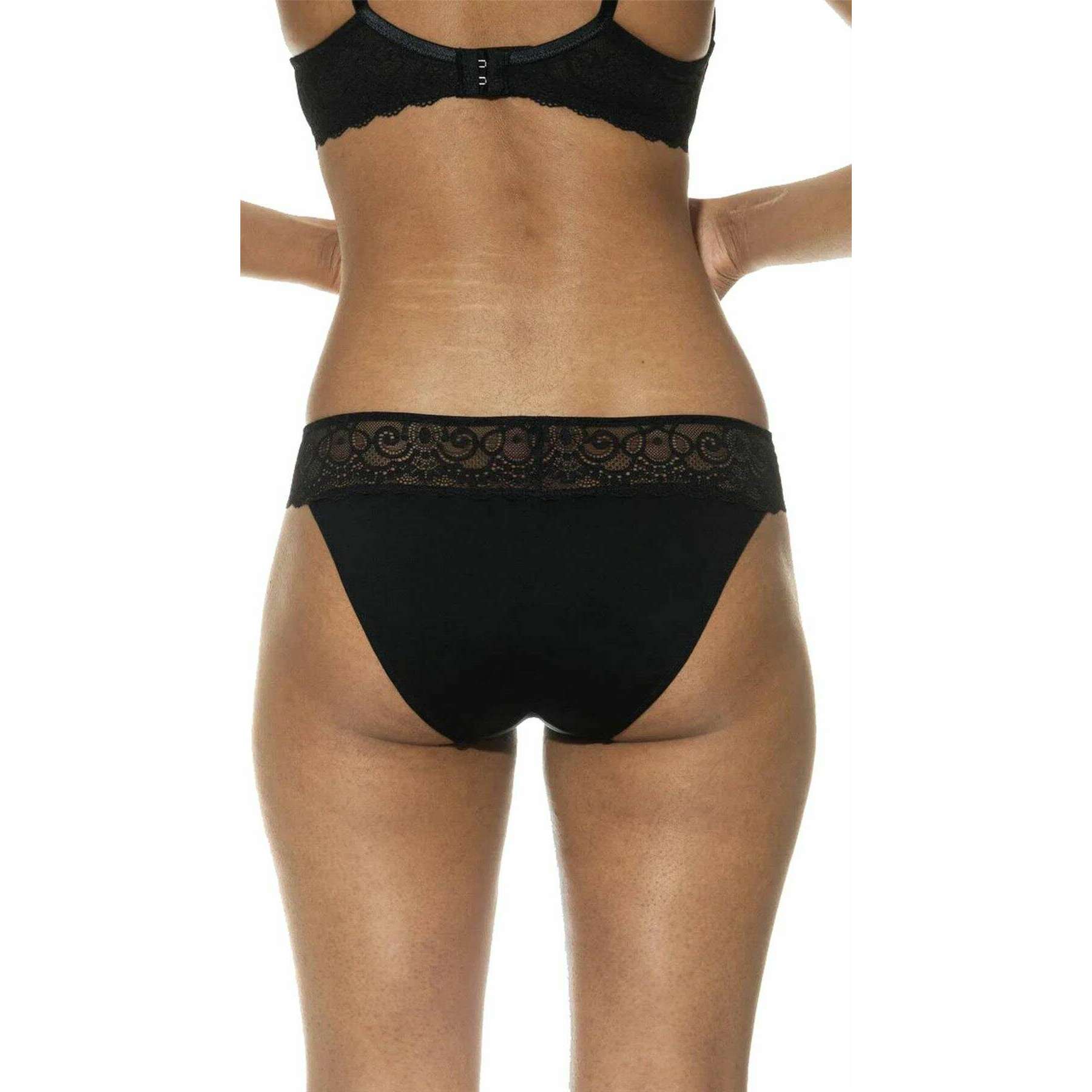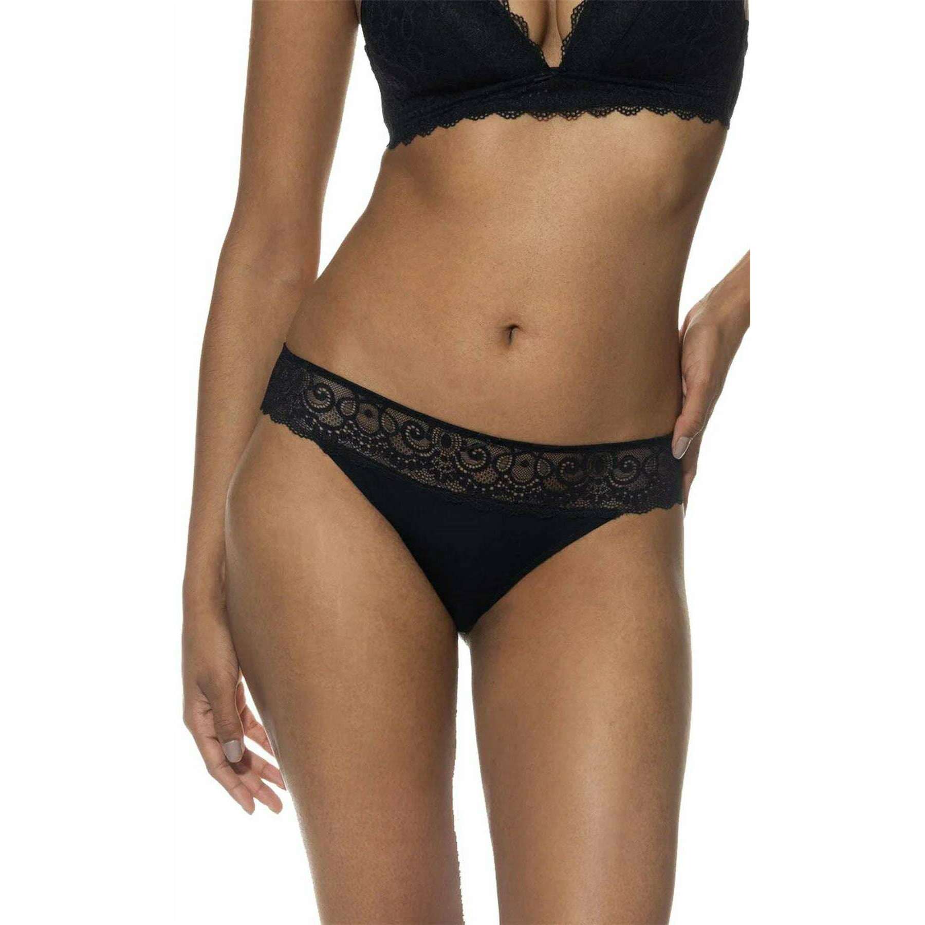 • Diepe middenhoogte, platte tailleband voor comfort, katoenen inzetstuk op kruisje, kanten details