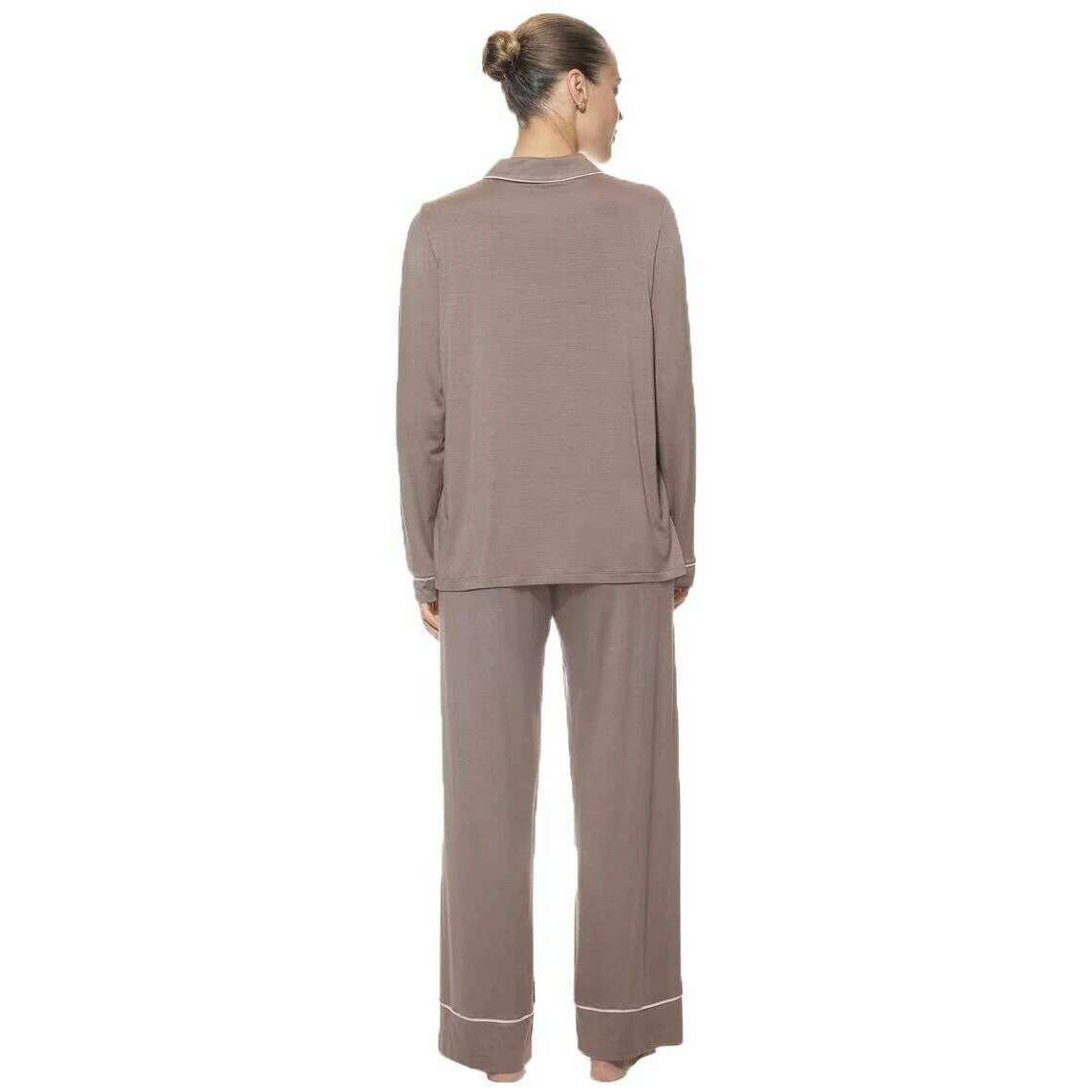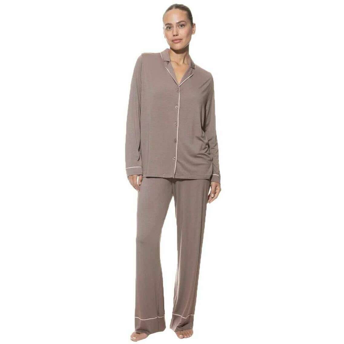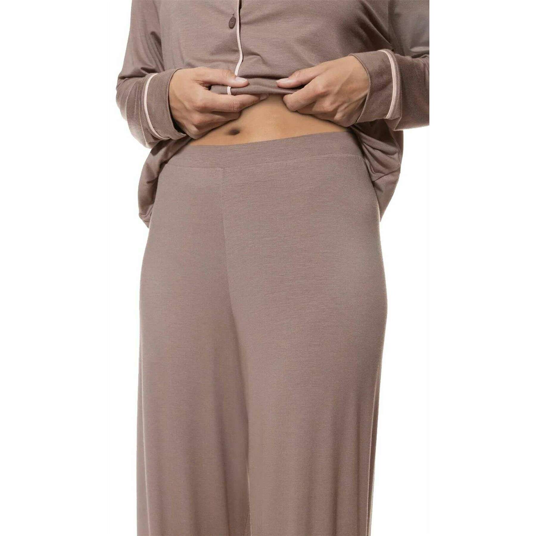Deze puur chique damespyjama met volledige lengte, aangeboden door het merk Mey, is gemaakt van 94% modal en 6% elastaan. Ook de milk n coffee beige pyjama is ontworpen in een effen patroon, Mey heeft deze pure chique lange pyjama gemaakt in Portugal. Het wordt aanbevolen om in de machine te wassen op 40 graden op een fijn programma, niet geschikt voor de droger om deze pyjama in goede staat te houden. Alle pyjama's worden compleet geleverd in een mey-verpakking. De Mey Pure Chic lange pyjama - Milk n Coffee Beige zal uw loungewear zeker naar een hoger niveau tillen, zodat u er stijlvol en comfortabel uitziet en een beetje luxe toevoegt aan uw vrije tijd. Gemaakt van modal en elastaan ​​zorgen voor warmte, zijn ademend en huidvriendelijk. De pasvorm met wijde pijpen zorgt voor bewegingsvrijheid en een niet-beperkend draagcomfort, terwijl de elastische tailleband met verstelbaar trekkoord voor de perfecte pasvorm zorgt. Dit overhemd is volledig dichtgeknoopt, heeft een omkeerbare kraag en lange mouwen. De decoratieve biesdetails maken deze set compleet.