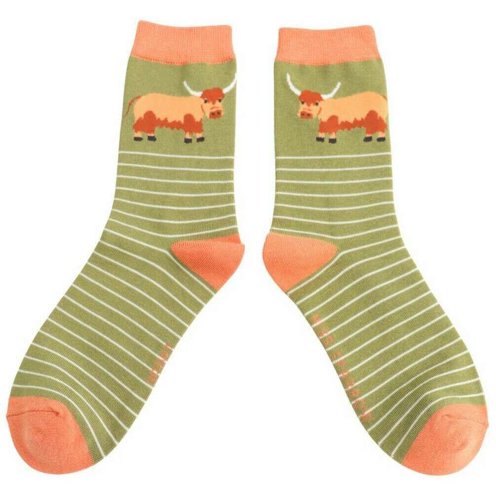Miss Sparrow London Highland Cow en Stripes Bamboe Sokken - Mosgroen