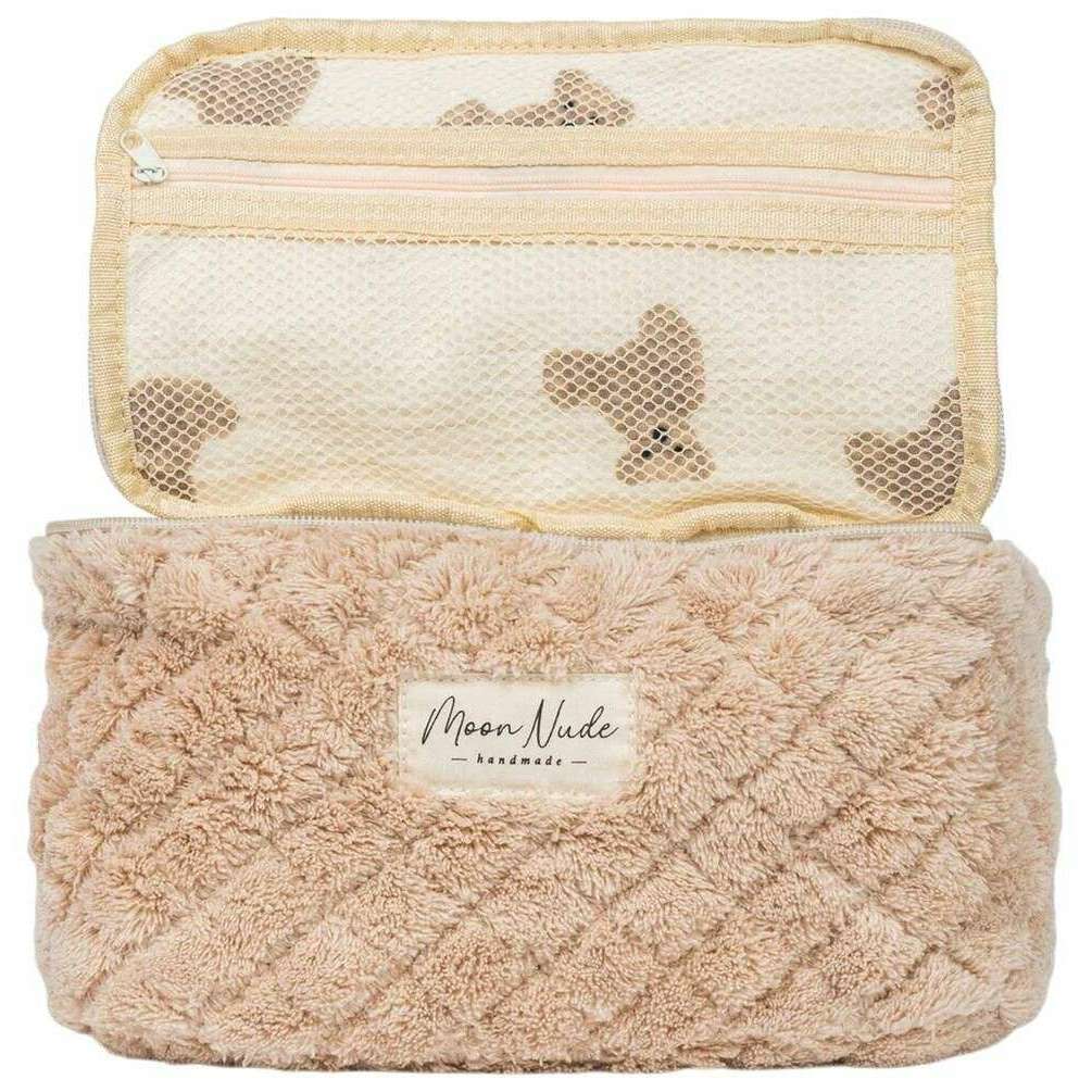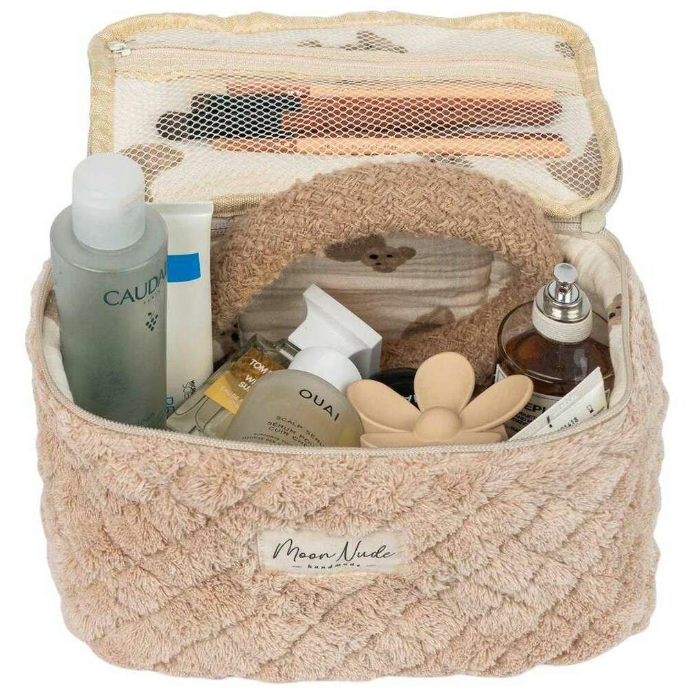Deze teddy toilettas voor dames is van het merk Moon Nude in een beige kleur en is gemaakt van 100% katoen. De afmetingen zijn 16 cm (hoogte) x 22 cm (breedte) x 14 cm (diepte). Het wordt aanbevolen om met de hand te wassen in koud water met een mild wasmiddel, of binnenstebuiten machinaal te wassen op een delicate cyclus. om deze tas in goede staat te houden. Alle tassen worden compleet geleverd met een maannaaktverpakking. De Moon Nude Teddy Vanity Bag - Beige is een absolute noodzaak voor op reis of voor dagelijks gebruik. Deze make-uptas bewaart gegarandeerd al je make-up of huidverzorging op één plek, terwijl hij ook stijlvol en modieus is met zijn handgemaakte gewatteerde ontwerp.