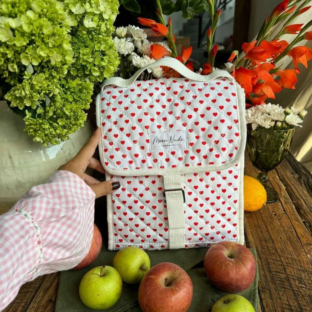 Ontwerper Moon Nude heeft deze damestas van 100% katoen in wit/rode tinten gepresenteerd. De afmetingen zijn 28 cm (hoogte) x 22,5 cm (breedte) x 17,5 cm (diepte). Het wordt aanbevolen om met de hand te wassen in koud water met een mild wasmiddel, of binnenstebuiten machinaal te wassen op een delicate cyclus. om deze tas in goede staat te houden. Alle tassen worden compleet geleverd met een maannaaktverpakking. De Moon Nude Valentijn Lunchtas - Wit/Rood is een musthave als je naar je werk reist of als kinderlunch. Deze lunchtas heeft een geïsoleerde binnenkant, zodat je warme spullen warm en je koude spullen koud blijven! Deze tas heeft ook een prachtig handgemaakt gewatteerd ontwerp, dat zeker de aandacht zal trekken van iedereen die je kent.