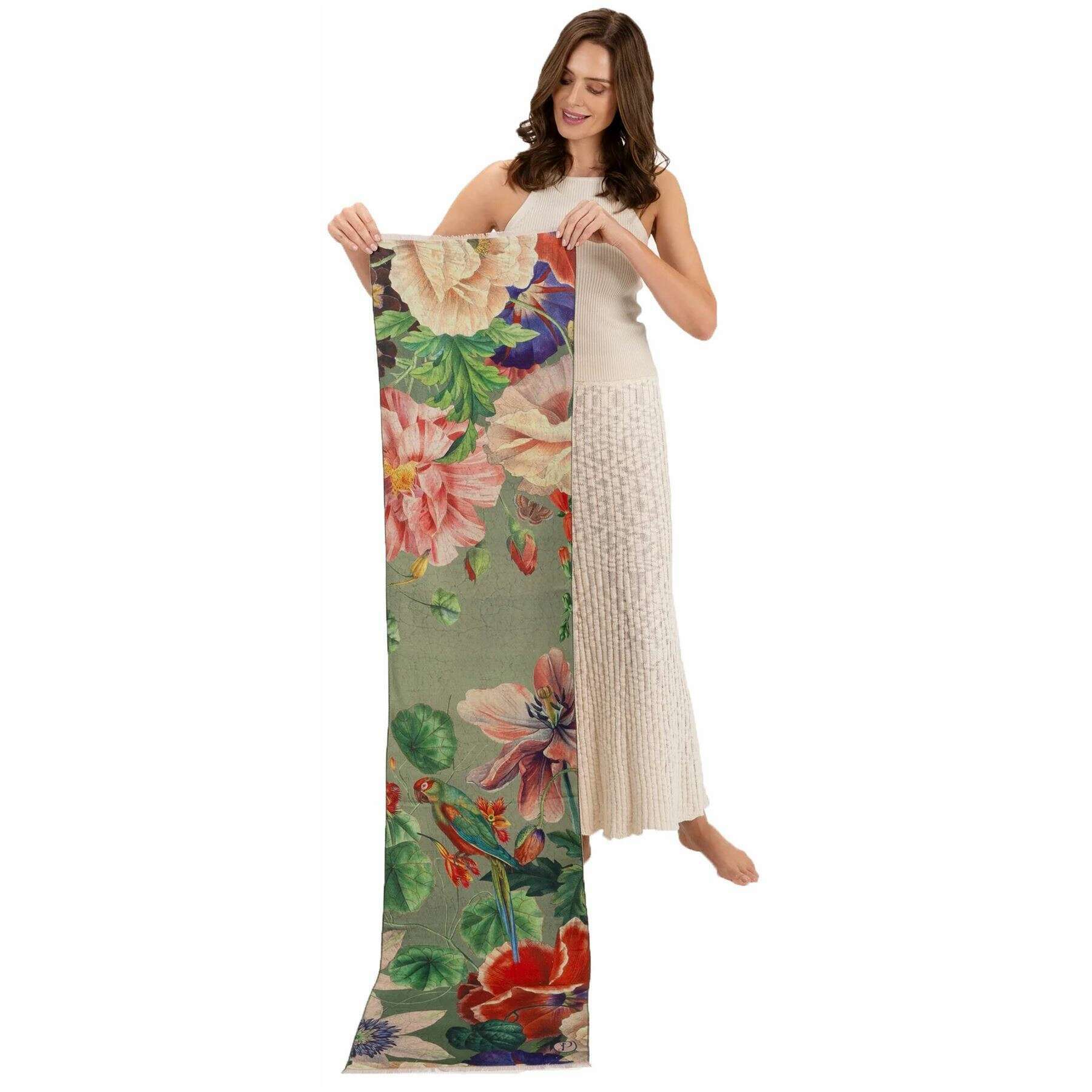 Perfect voor vrouwen is deze poeder salie groene botanische boeket lux sjaal, deze is ook gemaakt van 50% polyester en 50% viscose. Het meet 180 cm (hoogte) x 40 cm (breedte). Ook de salie groene sjaal is ontworpen in een bloemenpatroon, het wordt aanbevolen om alleen met de hand te wassen, niet te strijken, niet droog te tuimelen en niet droog schoon te maken om deze sjaal in goede staat te houden. Alle sjaals worden compleet geleverd met poedertags. De Powder Botanical Bouquet Lux -sjaal - Sage Green biedt een stijlvol levendige afwerking aan elke outfit. Luxueus zacht en groot genoeg om om je schouders te wikkelen als het buiten een beetje koud is of om het te dragen als een traditionele sjaal, zal hoe dan ook er elegant verbluffend uitzien. Met een enigszins omzoomde rand is deze prachtige sjaal essentieel voor uw collectie.