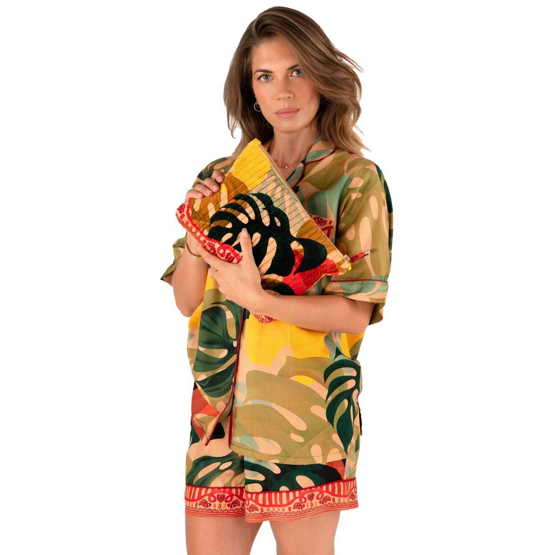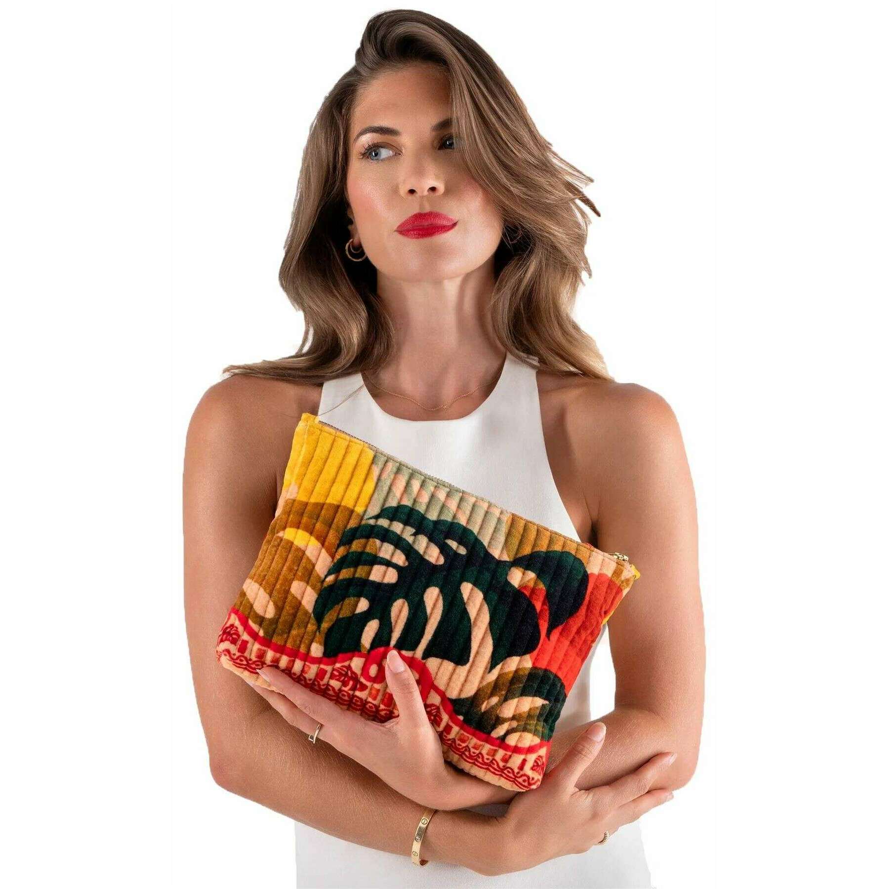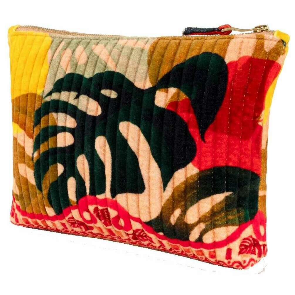 Poeder exotische bladeren gewatteerde fluwelen etui met ritssluiting - beige/rood/zwart