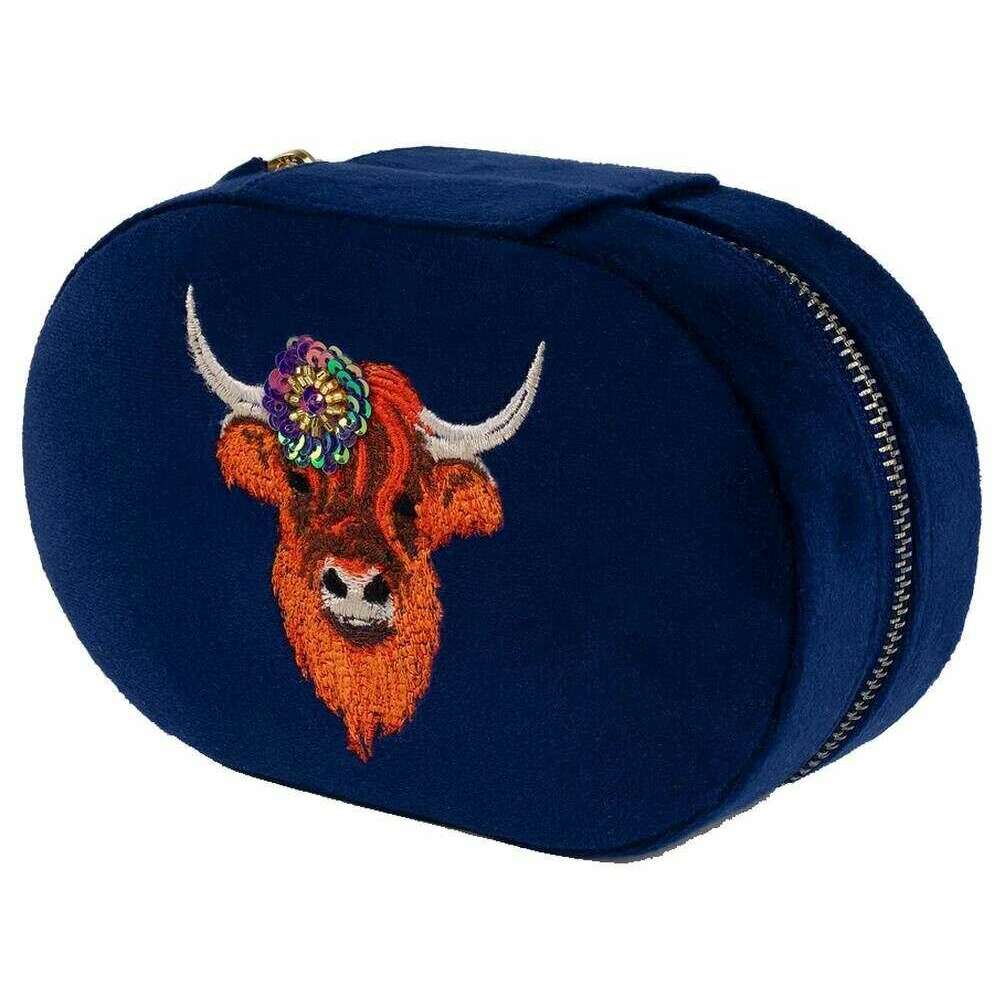 Poeder Highland Cow ovale sieradendoos - marineblauw/oranje/beige