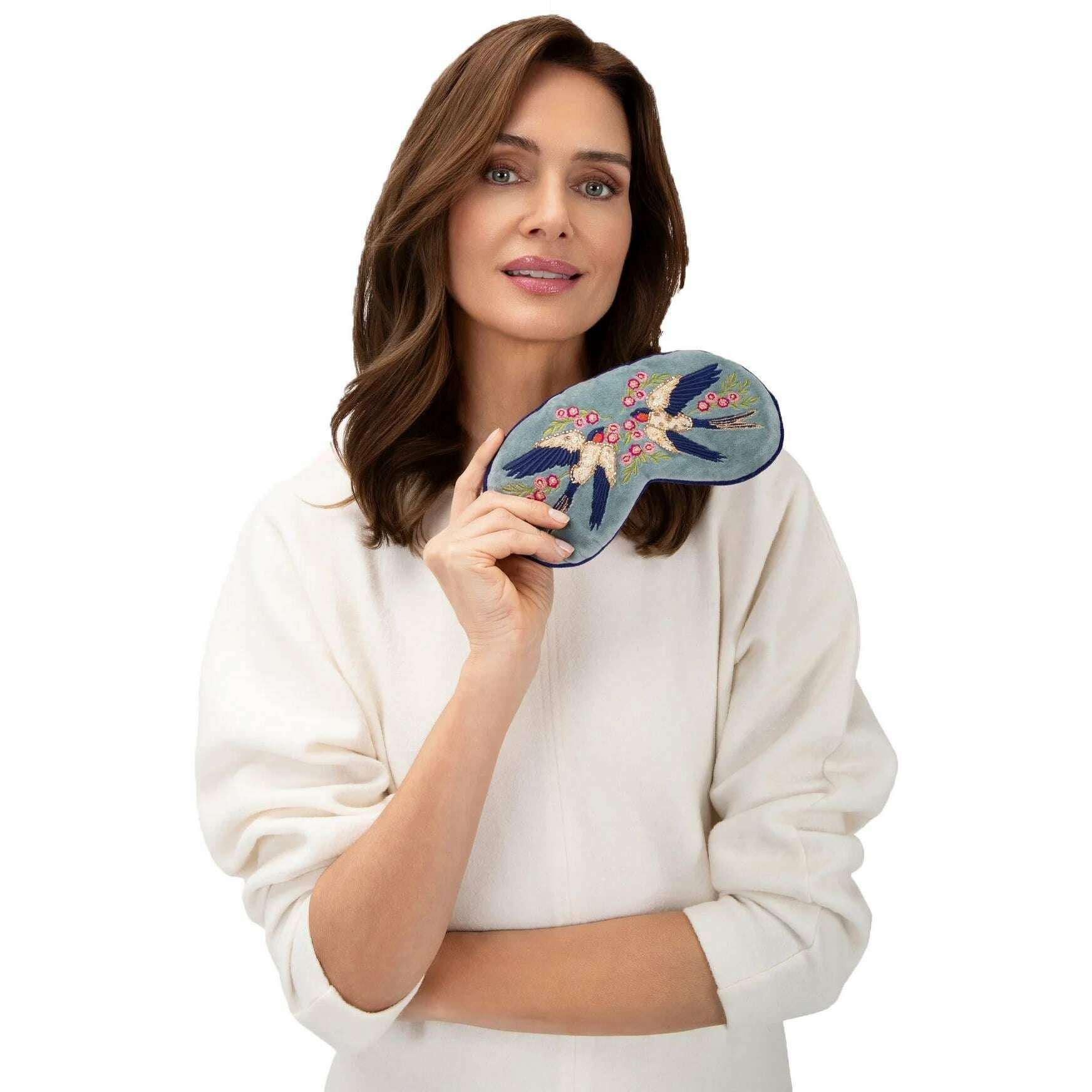 Dit dames duwelen slikt lavendel oogmasker door het merkpoeder is gemaakt van 100% polyester fluweel en wordt in blauw tentoongesteld. Het meet 9,5 cm (hoogte) x 20 cm (breedte). Alle oogmaskers worden compleet geleverd met poedertags. Het poeder dompelen slikt lavendel eye masker - ijsblauw maakt slaap zo veel luxer. De verbluffend zachte fluwelen afwerking zal ontspannend en comfortabel aanvoelen, en de elastische band zal het perfect op je hoofd beveiligen voor een vredige kleding, terwijl het lavendelaroma van de interne lavendelzaden je in slaap zal sturen. Het patroon is vakkundig geborduurd met verbluffende details, waardoor het een accessoire is dat u wilt laten zien.