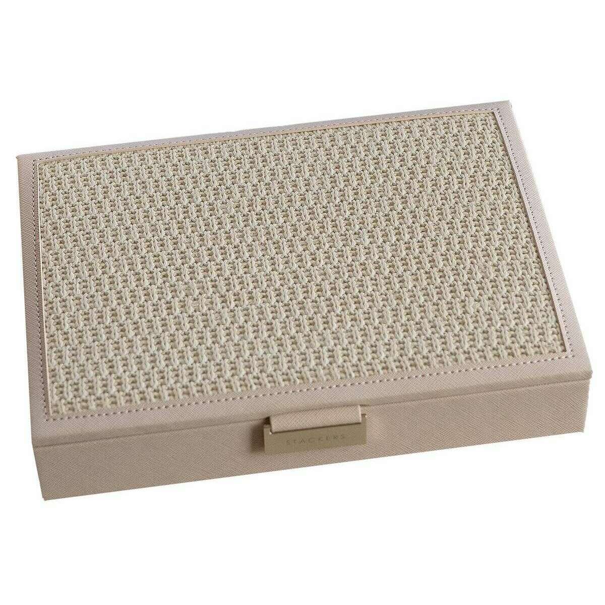 Dit klassieke sieradendoosje van Stackers is gemaakt van roze kunstleer en fluweel en is perfect voor vrouwen en een musthave. De afmetingen zijn 4,7 cm (hoogte) x 25 cm (breedte) x 18 cm (diepte). Alle sieradendoosjes worden compleet geleverd met stapelverpakking. Het Stackers Classic Jewellery Box-deksel - Blush Pink Raffia heeft een prachtig roze raffia-ontwerp. Deze sieradendoosdeksel is perfect voor het opbergen van al je sieraden! Wordt compleet geleverd met secties in verschillende maten voor ringen, oorbellen, armbanden en kettingen.