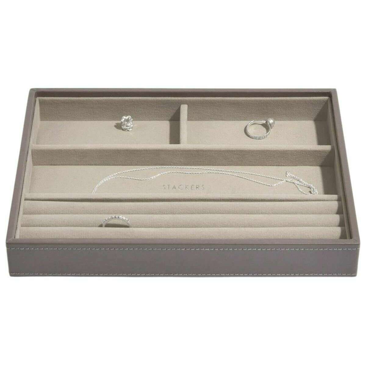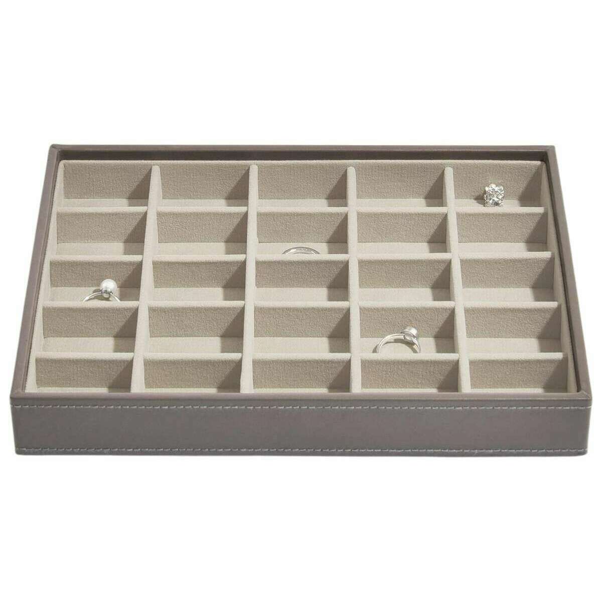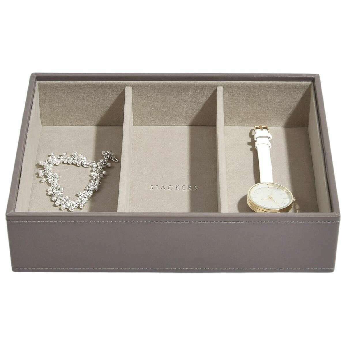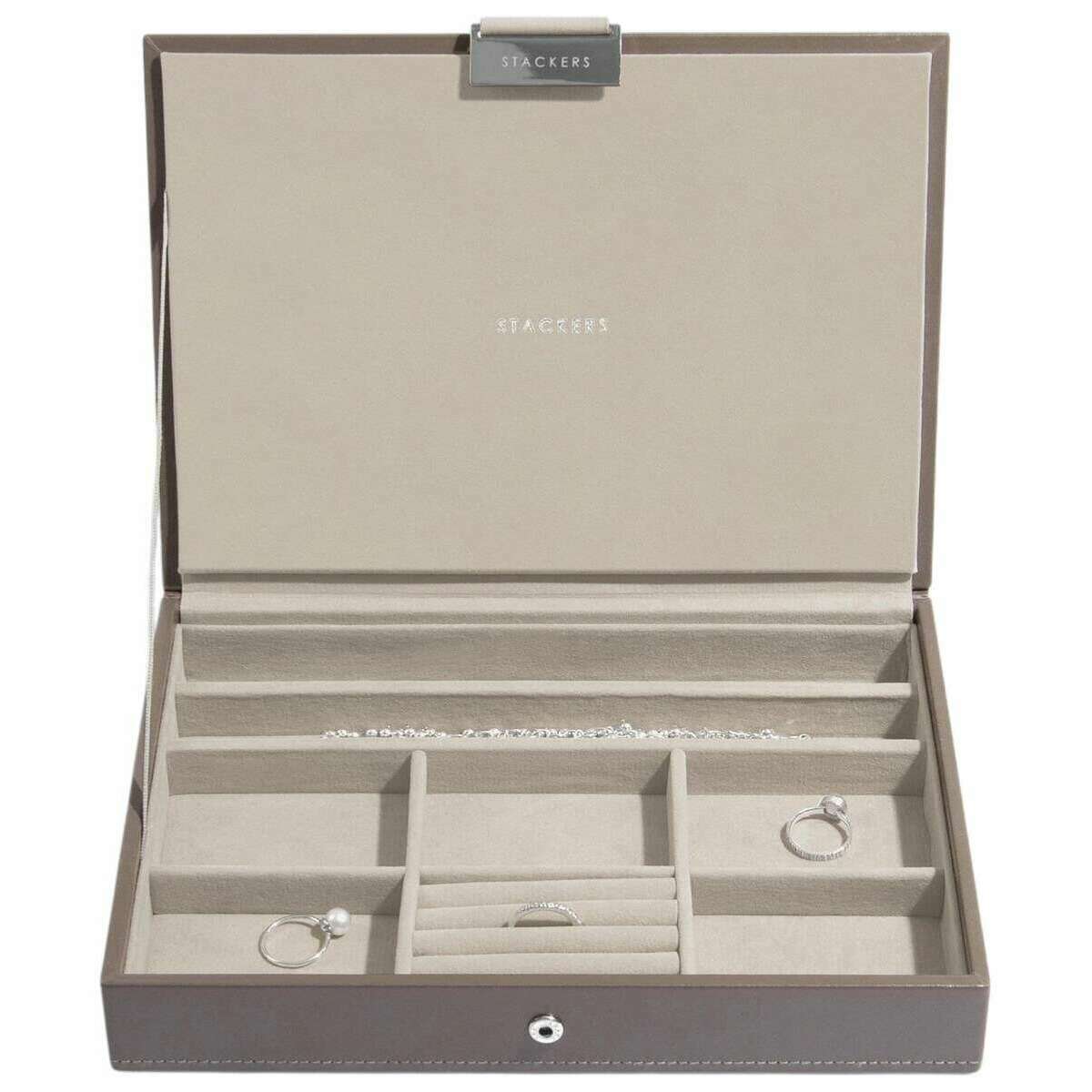 Deze goed gemaakte klassieke sieradendoos voor dames, set van 4 van Stackers, wordt geleverd in een nertsbruine kleur en is vervaardigd van kunstleer en fluweel. De afmetingen zijn 19,5 cm (hoogte) x 25 cm (breedte) x 18 cm (diepte). Het wordt aanbevolen om deze sieradendoos schoon te vegen om deze in goede staat te houden. Alle sieradendoosjes worden compleet geleverd met stapelverpakking. De Stackers Classic Jewellery Box set van 4 - Mink Brown zal zeker indruk maken met zijn ongelooflijke hoeveelheid ruimte. Met een bovenste gedeelte met deksel voor die kostbare kleine stukjes, een middelste bakje met 25 vakken voor bedeltjes of ringen, nog een middelste bakje met drie vakken voor je armbanden en halskettingen met ringrollen om meer ringen en oorbellen in op te bergen, en de onderkant is een diepe doos met drie vakken voor grotere spullen zoals grote armbanden, horloges en zonnebrillen. Maak dit de meest ideale sieradendoos die je kunt bezitten en biedt zoveel op de meest luxueuze manier.