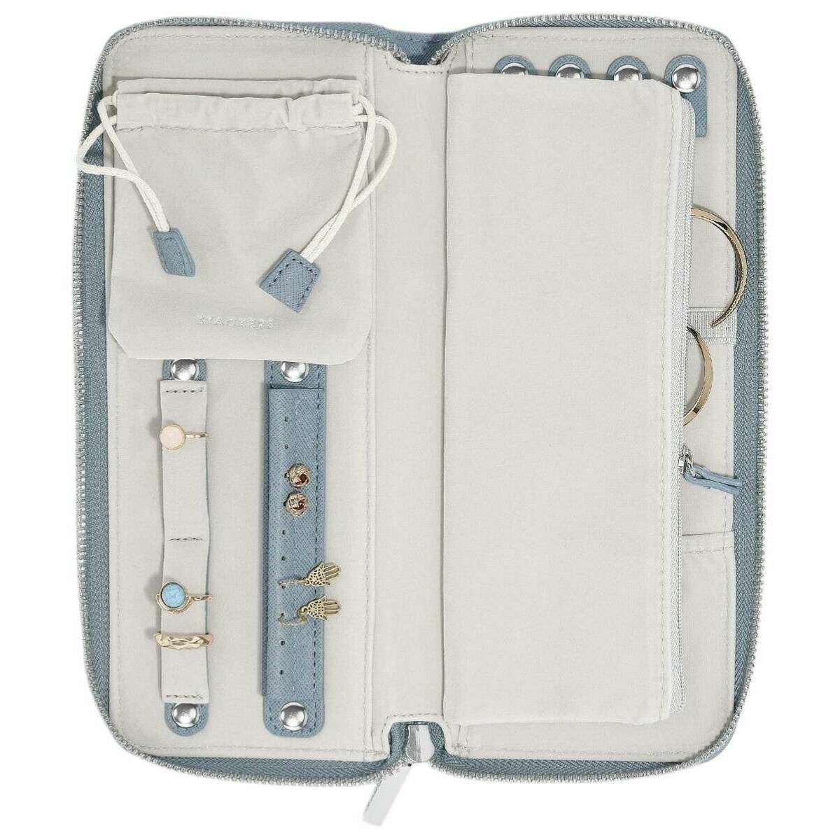 Deze klassieke medium sieradenrol van Stackers is gemaakt van blauw kunstleer en fluweel en is perfect voor dames en een musthave. De afmetingen zijn 3 cm (hoogte) x 24,5 cm (breedte) x 10,5 cm (diepte). Het wordt aanbevolen om deze sieradendoos schoon te vegen om deze in goede staat te houden. Alle sieradendoosjes worden compleet geleverd met stapelverpakking. De Stackers Classic Medium Sieradenrol - Dusky Blue beschikt over een verscheidenheid aan onderdelen waarmee u uw sieraden altijd en overal kunt ordenen. Alles veilig dankzij de ritssluiting. Je kunt er zeker van zijn dat je favoriete sieraden altijd veilig binnenin zitten. Deze rol biedt ruimte voor maximaal vier halskettingen of armbanden, heeft een oorbelhouder en een klein fluwelen zakje om kleine en losse spullen veilig te bewaren. Een bijzonder onderdeel van deze accessoirekoffer is dat je favoriete kettingen en armbanden kunt opbergen zonder dat ze in de knoop raken. Dit is de perfecte sieradenorganizer voor onderweg of om je huis netjes en opgeruimd te houden.