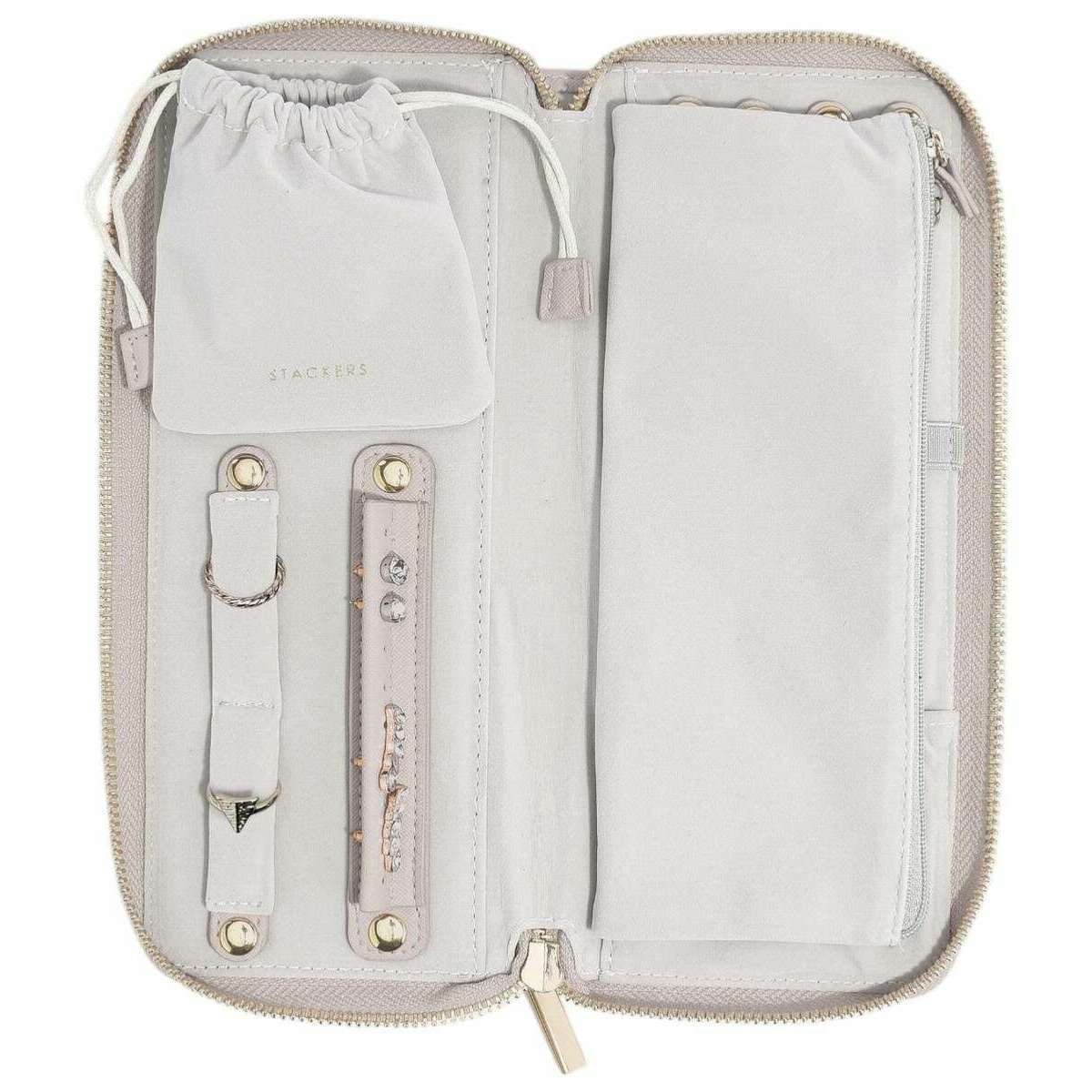 Deze taupebeige klassieke medium sieradenrol voor dames van ontwerper Stackers is gemaakt van kunstleer en fluweel. De afmetingen zijn 3 cm (hoogte) x 24,5 cm (breedte) x 10,5 cm (diepte). Het wordt aanbevolen om deze sieradendoos schoon te vegen om deze in goede staat te houden. Alle sieradendoosjes worden compleet geleverd met stapelverpakking. De Stackers Classic Medium Sieradenrol - Taupe Beige beschikt over een verscheidenheid aan onderdelen waarmee u uw sieraden altijd en overal kunt ordenen. Alles veilig dankzij de ritssluiting. Je kunt er zeker van zijn dat je favoriete sieraden altijd veilig binnenin zitten. Deze rol biedt ruimte voor maximaal vier halskettingen of armbanden, heeft een oorbelhouder en een klein fluwelen zakje om kleine en losse spullen veilig te bewaren. Een bijzonder onderdeel van deze accessoirekoffer is dat je favoriete kettingen en armbanden kunt opbergen zonder dat ze in de knoop raken. Dit is de perfecte sieradenorganizer voor onderweg of om je huis netjes en opgeruimd te houden.