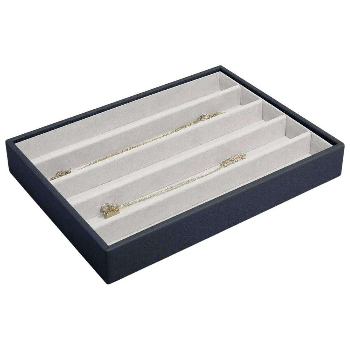 Deze klassieke dameskettinglaag is gemaakt van kunstleer en fluweel, uitgevoerd in een navy kleur en is van het merk Stackers. De afmetingen zijn 3,7 cm (hoogte) x 25 cm (breedte) x 18 cm (diepte). Het wordt aanbevolen om deze sieradendoos schoon te vegen om deze in goede staat te houden. Alle sieradendoosjes worden compleet geleverd met stapelverpakking. De Stackers Classic Necklace Layer - Navy Blue heeft vijf lange secties die een perfecte laag zijn om kettingen, armbanden en hangers op te bergen. De secties zijn ook compatibel met lange charmbars. Gevoerd met prachtig fluweel om je sieraden in onberispelijke staat te houden. Kan op zichzelf staand op je dressoir worden gebruikt of in combinatie met andere stukken om een ​​grotere sieradendoos te bouwen.
