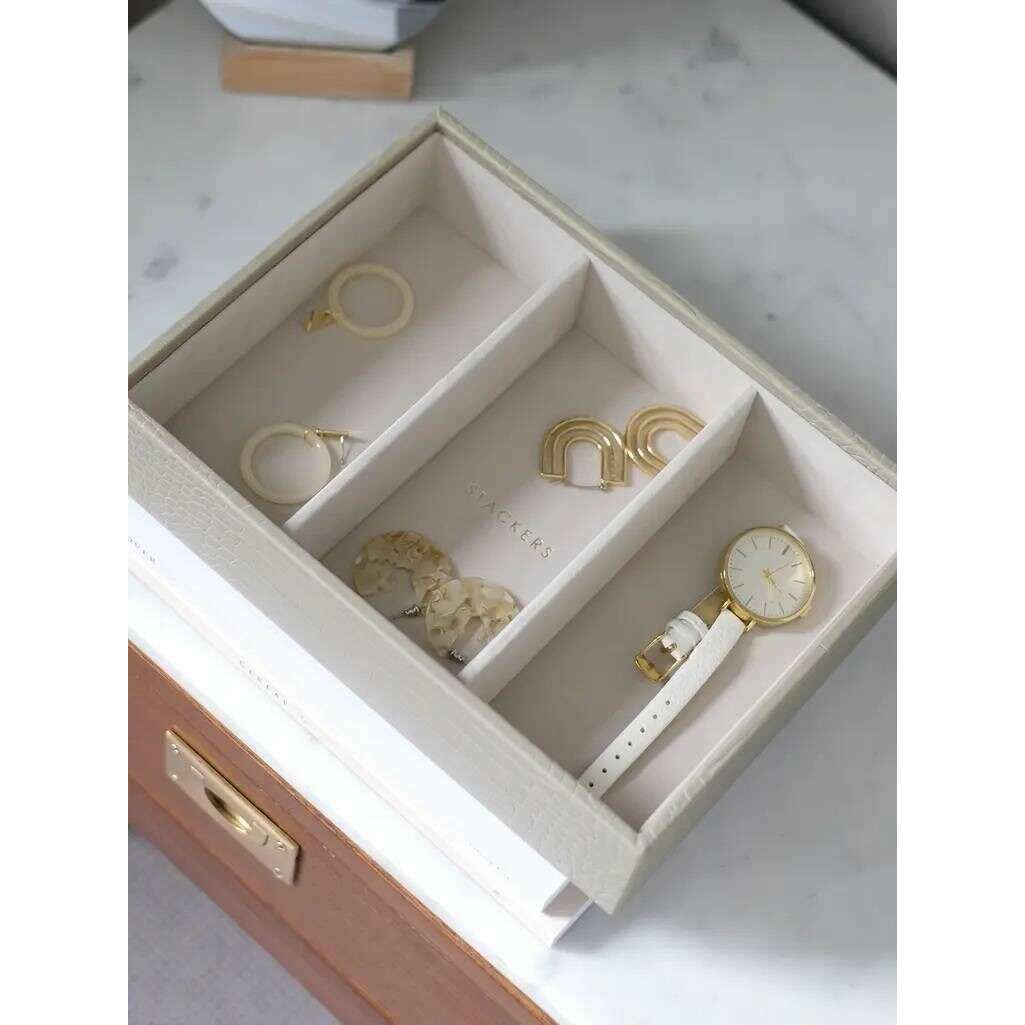 Ontwerper Stackers heeft dit damessieradendoosje van kunstleer en fluweel voor je uitgebracht in stopty grijze tinten. De afmetingen zijn 6 cm (hoogte) x 25 cm (breedte) x 18 cm (diepte). Het wordt aanbevolen om deze sieradendoos schoon te vegen om deze in goede staat te houden. Alle sieradendoosjes worden compleet geleverd met stapelverpakking. De Stackers Classic Watch Accessory Layer - Putty Grey is perfect voor het opbergen van brillen en grotere accessoires en kan worden gebruikt als opbergruimte in een lade of worden gestapeld met andere lagen uit de Stackers-collectie om een ​​op maat gemaakte sieradendoos te creëren. Ideaal voor vrouwen die graag accessoires dragen. Dit mooie laagje ziet er elegant en stijlvol uit en is professioneel vervaardigd uit hoogwaardige materialen.