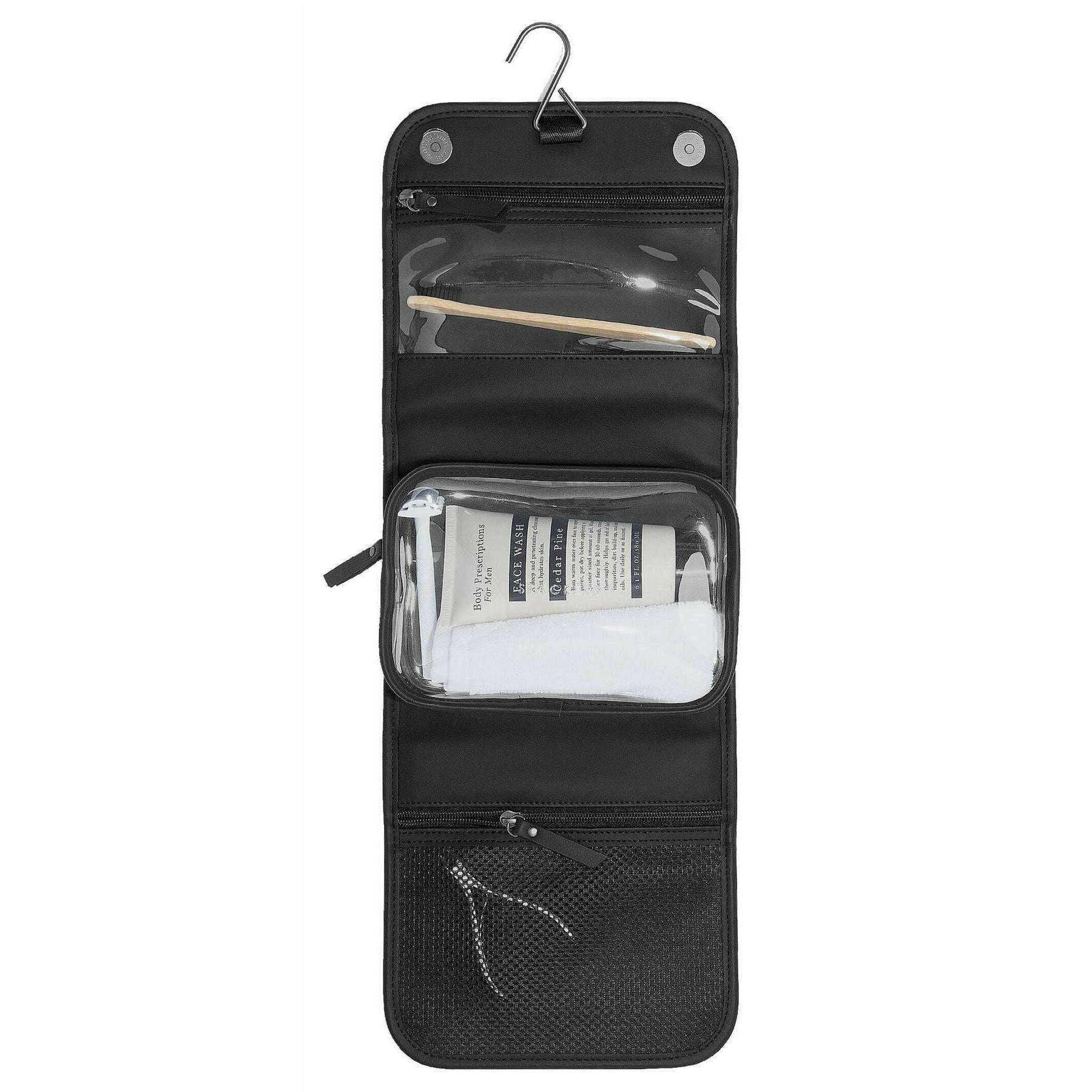 • 2 interne compartimenten met ritssluiting, verwijderbare doorzichtige toilettas, ophanghaak