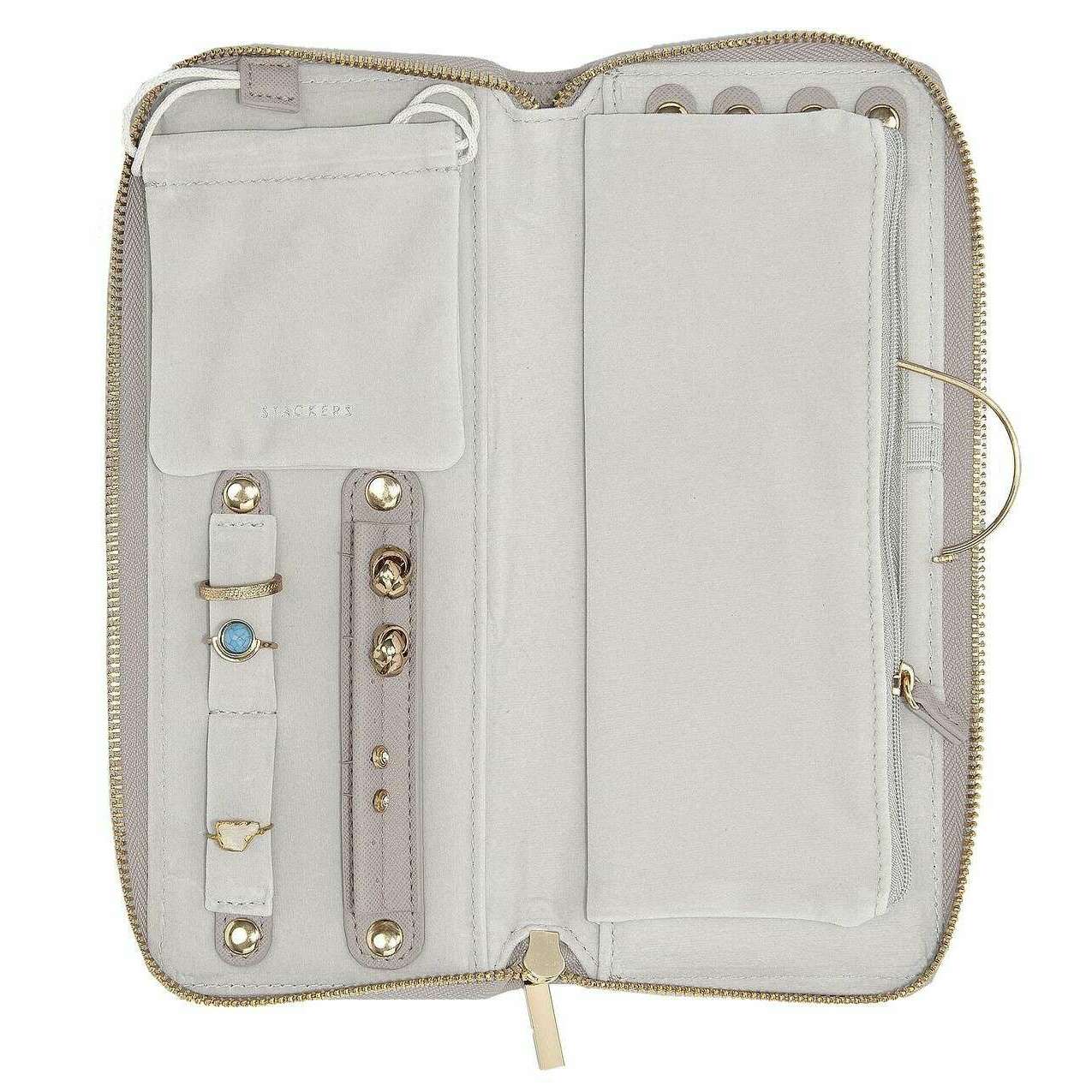 Deze dames sieradenrol van het merk Stackers is gemaakt van kunstleer en is uitgevoerd in het grijs. De afmetingen zijn 3 cm (hoogte) x 24,5 cm (breedte) x 10,3 cm (diepte). Alle sieradendoosjes worden compleet geleverd met stapelverpakking. De Stackers Sieradenrol - Taupe Woven Grey is een musthave voor onderweg! Deze taupe sieradenrol is perfect voor op reis met sieraden en is voorzien van een ritssluiting voor extra veiligheid.