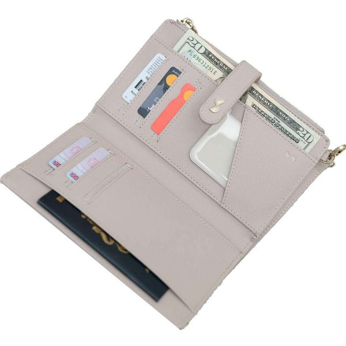 • Extern telefoonzakje , 6 kaartsleuven , Cosmetische spiegel , Afneembaar muntzakje met ritssluiting , Afneembare polsband , Drukknoopsluiting