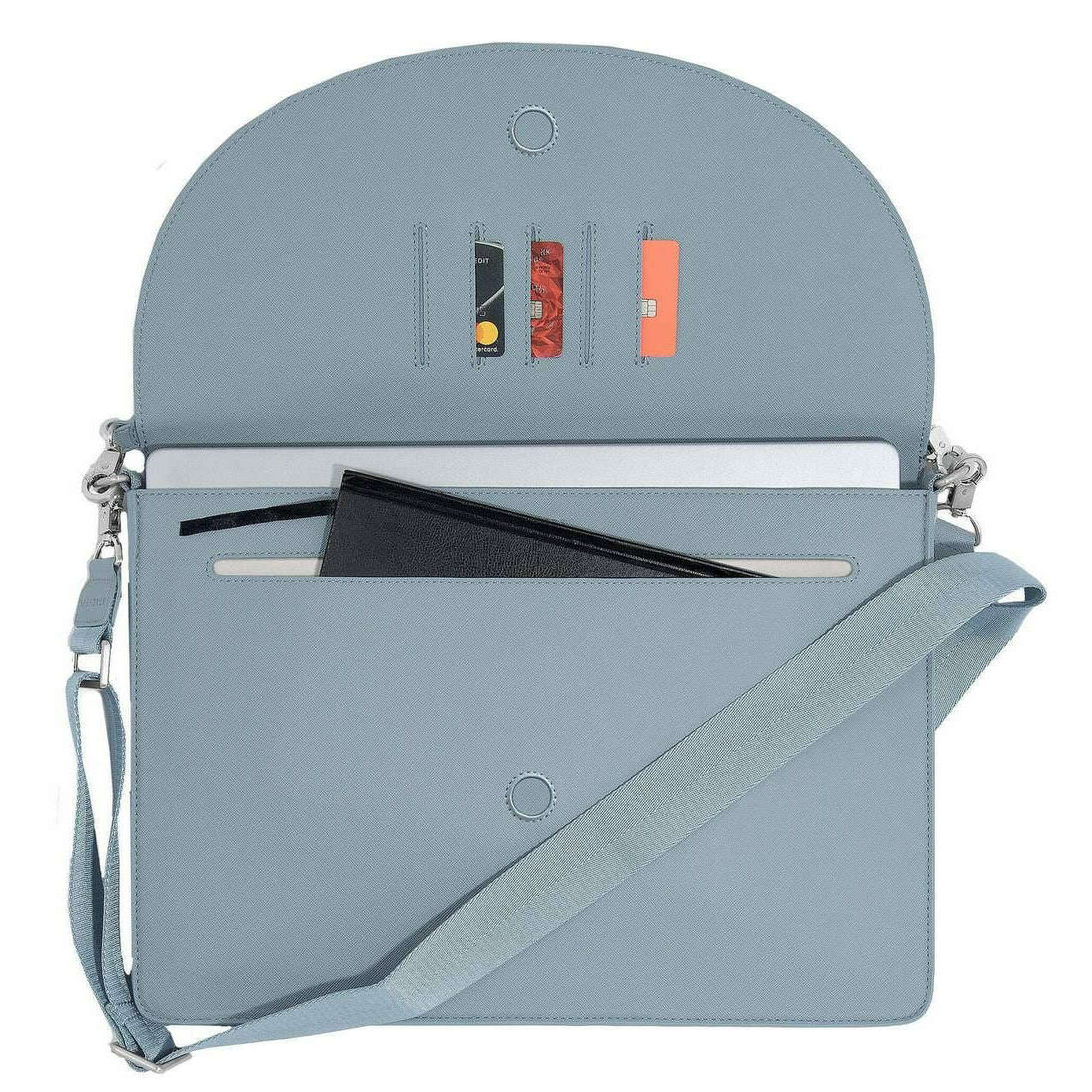 • Afneembare handgreep aan de bovenkant, Crossbody-riem, Gewatteerde hoes voor laptop, Ruimte voor notebook en kaarten, Extra achterzak met ritssluiting