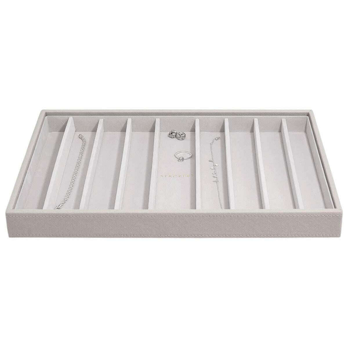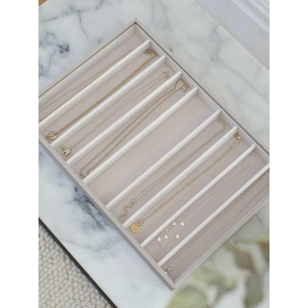 Deze goed gemaakte supersize kettinglaag voor dames van Stackers wordt geleverd in een taupebeige kleur en is vervaardigd van kunstleer en fluweel. De afmetingen zijn 4 cm (hoogte) x 36 cm (breedte) x 23,9 cm (diepte). Het wordt aanbevolen om deze sieradendoos schoon te vegen om deze in goede staat te houden. Alle sieradendoosjes worden compleet geleverd met stapelverpakking. De Stackers Supersize Necklace Layer - Taupe Beige is ontworpen om uw kettingen georganiseerd en in de knoop te houden. Met een zachte fluwelen binnenkant zal dit zeker indruk maken op degenen die veel sieraden moeten ordenen en beschermen tegen beschadiging. Dit is perfect om op je ladekast of dressoir te bewaren vanwege het eenvoudige ontwerp waardoor het in elke kamer past, of het kan worden gecombineerd met andere extra grote lagen om je perfecte sieradendoosje te creëren.