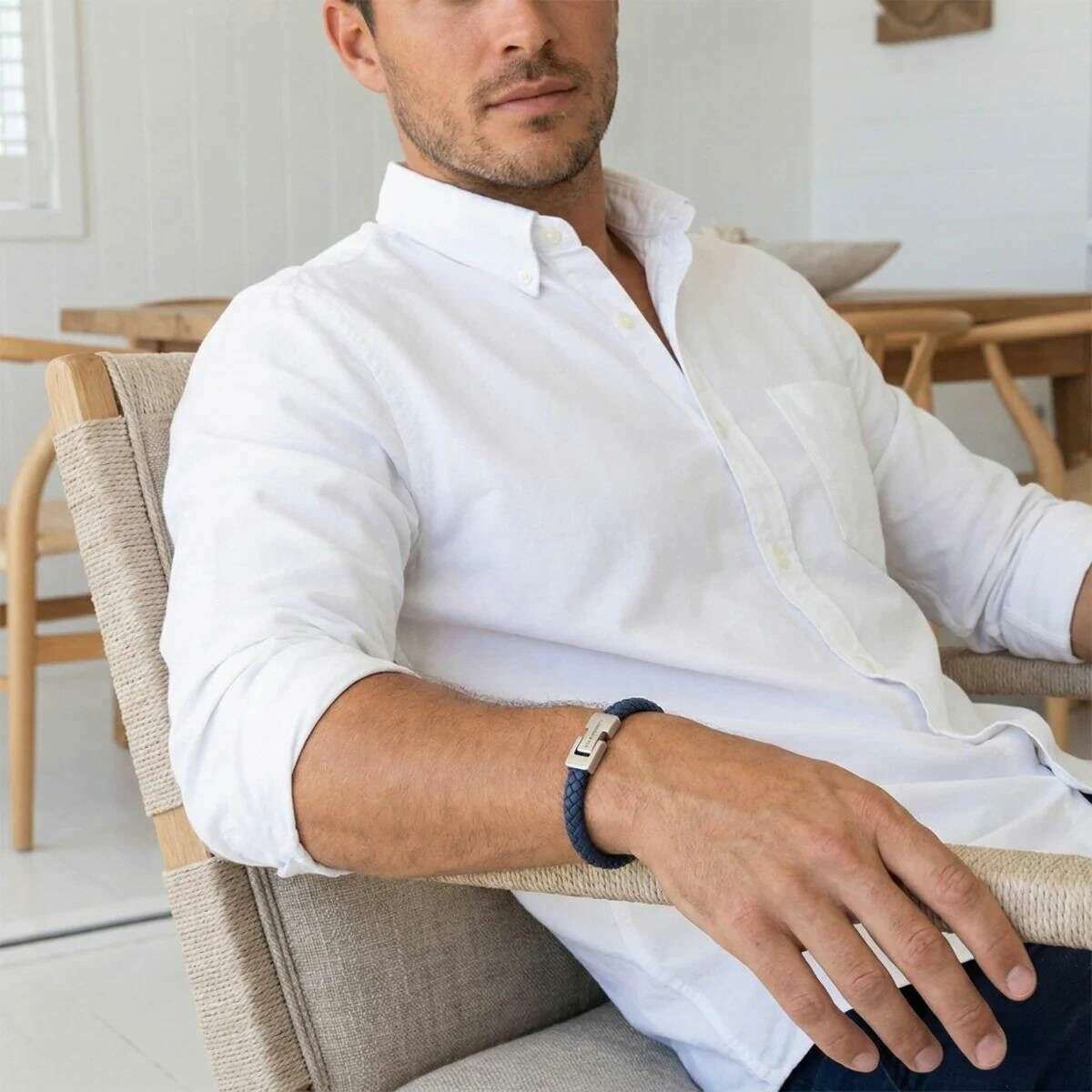 Deze heren archie gevlochten leren armband is gemaakt van 100% nappaleer en roestvrij staal, uitgevoerd in een blauwe kleur en is van het merk Steel & Barnett. Alle armbanden worden compleet geleverd met een stalen en barnett-verpakking. De Steel & Barnett Archie gevlochten leren armband - Jeansblauw belichaamt de perfecte balans tussen eenvoud en elegantie. De gladde band van 8 mm is vakkundig met de hand gemaakt van echt nappaleer en zorgt voor een strakke, minimalistische esthetiek die geschikt is voor elke stijl. Het ontwerp wordt versterkt door een kenmerkende geborstelde zilveren sluiting, fijn gegraveerd met het STEEL & BARNETT-logo, wat een subtiel vleugje onderscheiding biedt. De armband is gebouwd voor een lange levensduur en is voorzien van een hoogwaardige 316L roestvrijstalen sluiting, geroemd om zijn duurzaamheid en corrosiebestendigheid. De magnetische sluiting zorgt voor moeiteloos dragen en zorgt de hele dag voor een veilige en comfortabele pasvorm. De Archie is veelzijdig en verfijnd en gaat naadloos over van formele gelegenheden naar casual settings, waardoor een laagje ingetogen verfijning aan elke outfit wordt toegevoegd.