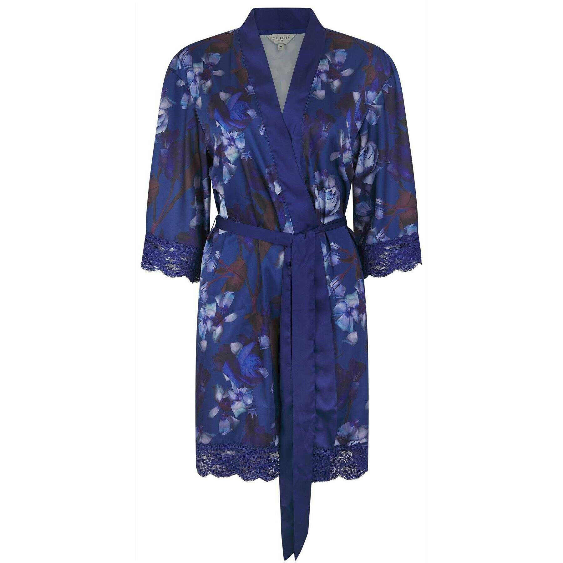 Deze goed gemaakte kimono-jas voor dames van Ted Baker wordt geleverd in een donkerblauwe digitale printkleur en is vervaardigd van 97% polyester en 3% spandex. Ook de donkerblauwe kamerjas met digitale print is ontworpen in een bloemmotief. Alle kamerjassen worden compleet geleverd met een ted baker-verpakking. De Ted Baker Taylor Kimono Robe - Donkerblauwe digitale print, luxueus en verfijnd, zal een geweldige aanvulling zijn op elke damesloungewearcollectie. Het heeft een zijdeachtige look met een all-over bloemendessin, een 3/4-mouwen, kant aan de mouwen en onderkant en een riem zorgen voor een chique uitstraling. De zachte en ademende stof houdt je warm en tegelijkertijd koel tijdens het loungen in je huis. Afgewerkt met een metalen Ted Baker-versieringslabel.